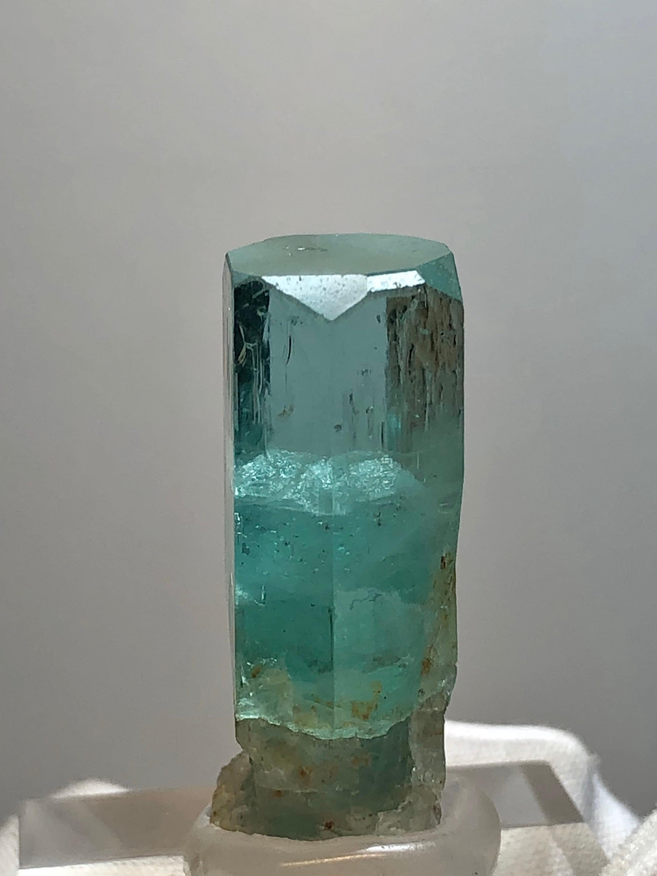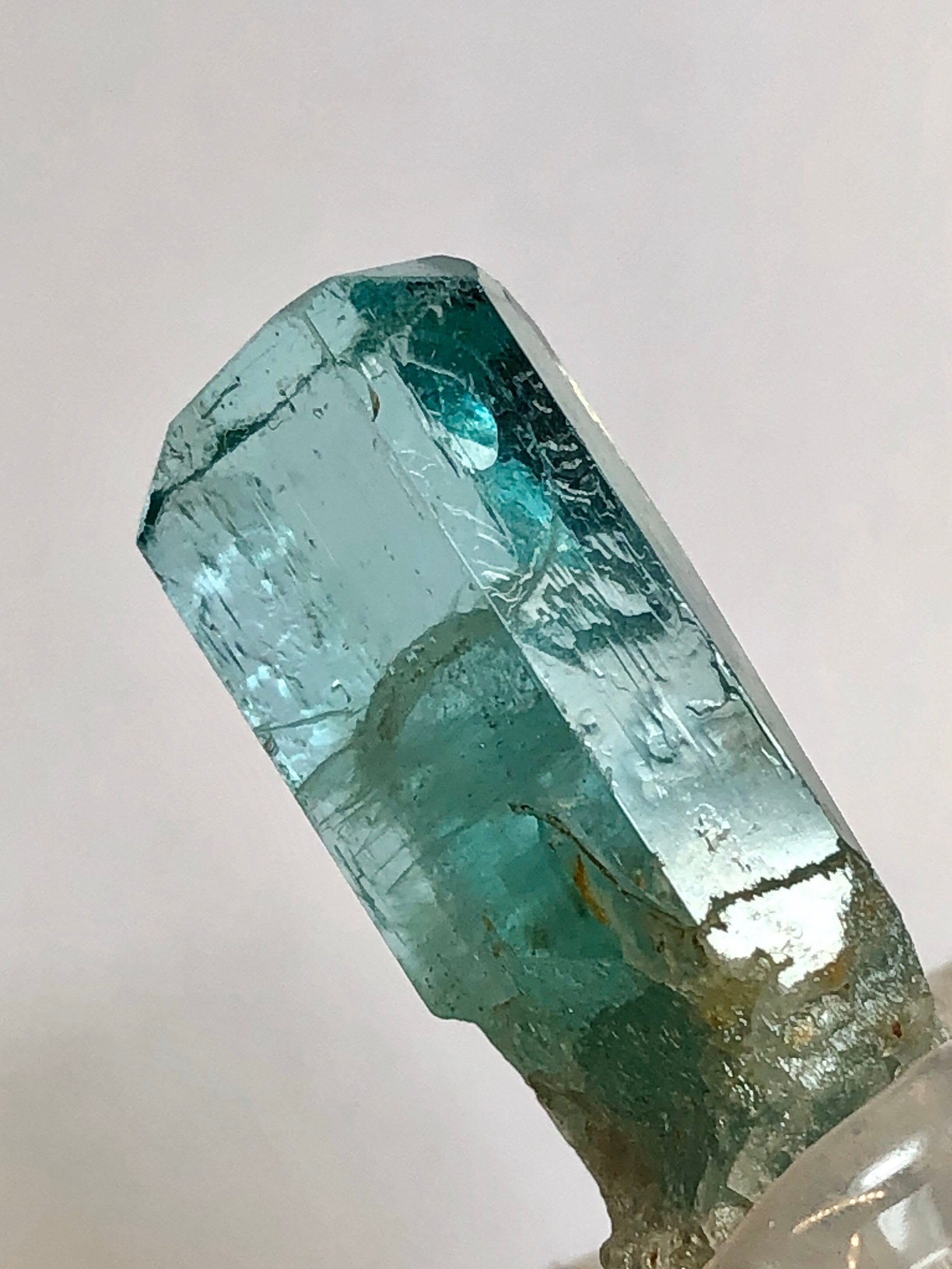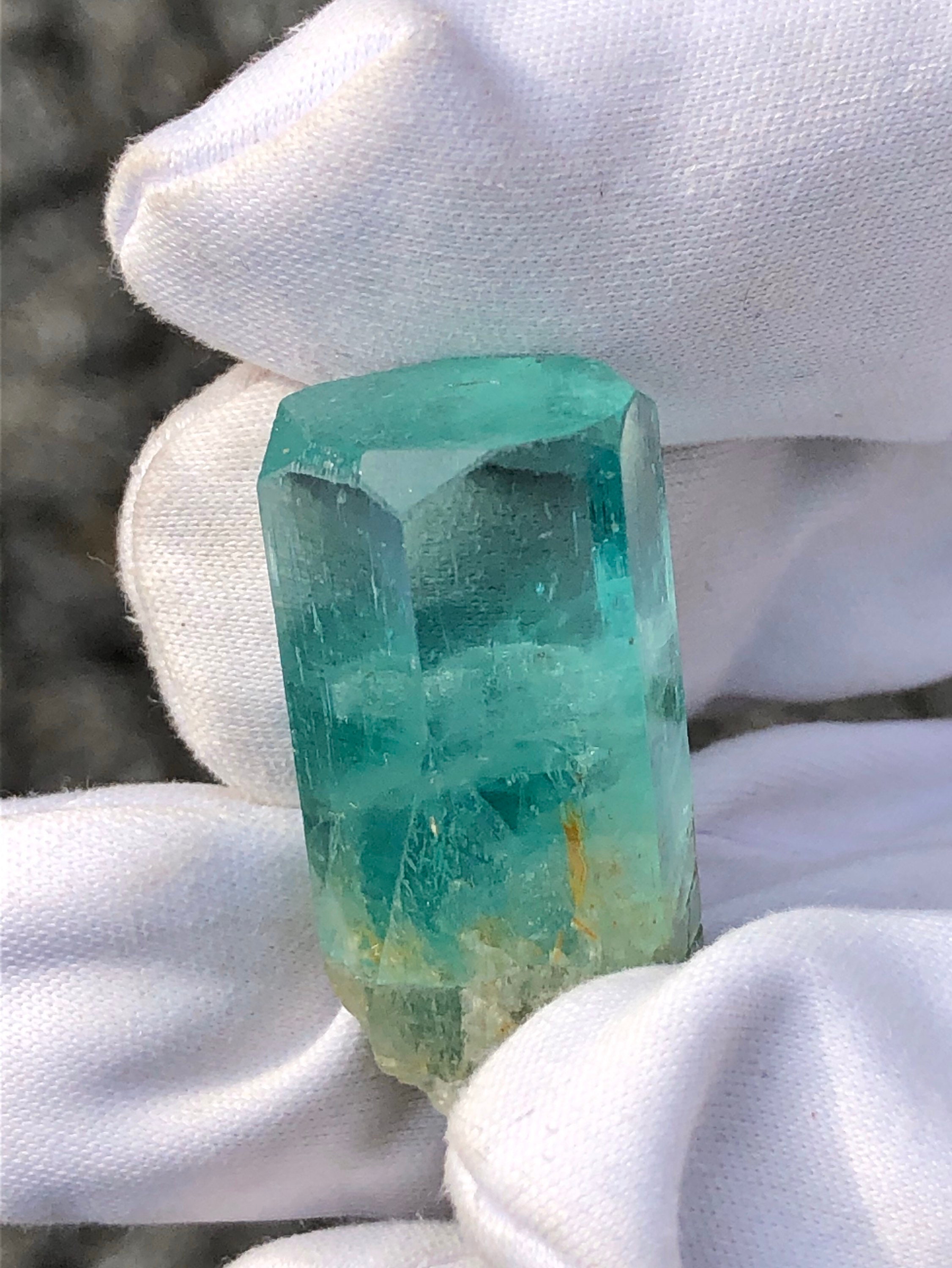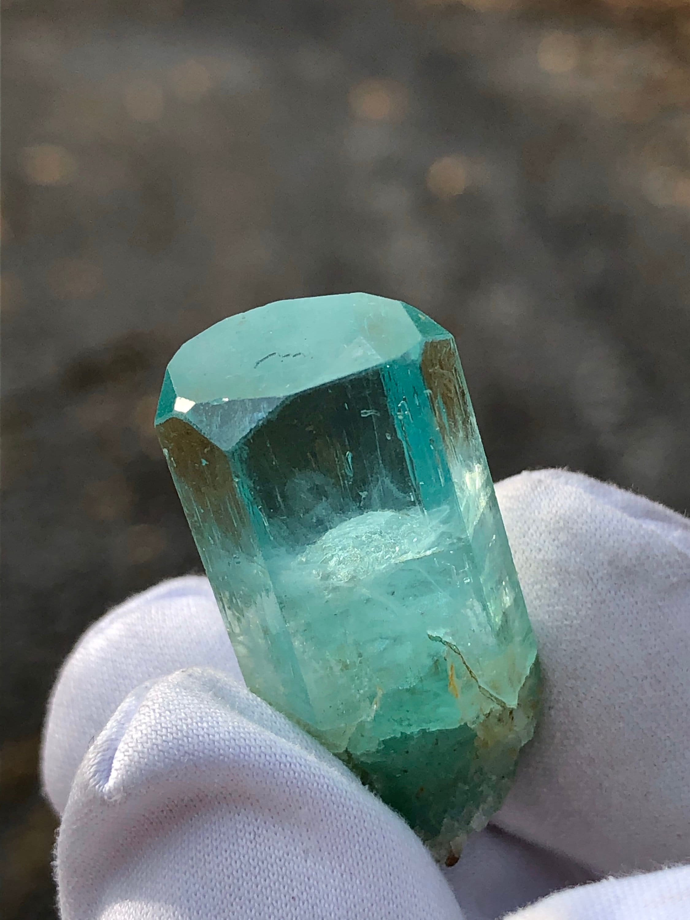 This listing is for the Exact Beryl crystal shown in the photos. This is a Rare Lagoon Beryl from Madagascar. It weighs 10.2 grams / 51 carats and measures 33.33 mm long end-to-end, 14.07mm side to side, and 11.28mm thick. This variety is highly sought and rarely available due to most clear crystals being cut into blue-green gemstones. These particular Madagascan beryls are said to contain chromium and vanadium. I’ve witnessed some parts of this crystal turn red when under strong uv light. The top termination looks great with an open c-axis revealing what lies beneath. The pyramidal pinacoid phantom inside of the main crystal has a soccer ball type of appearance, and is hexagonal as well. The bottom of this crystal is naturally etched with a few tiny red hematoid Quartz crystals who’s terminations naturally sync into the lagoon beryls morphology. This is a beautiful specimen. The Metaphysical value of this special crystal is astounding. Shifting from blue to green, spearmint and peppermint it seems, This is a heart / throat chakra activation Crystal, which is excellent for aligning the inner voice of the heart with the outer voice of self expression. The Hexagon has to do with Saturn and Karma. This crystal could assist in Karmic clearing. It has a strong Metaphysical presence, which is why I have held it in my collection for so long. Feel free to contact me with questions. Thanks for looking at my listing!