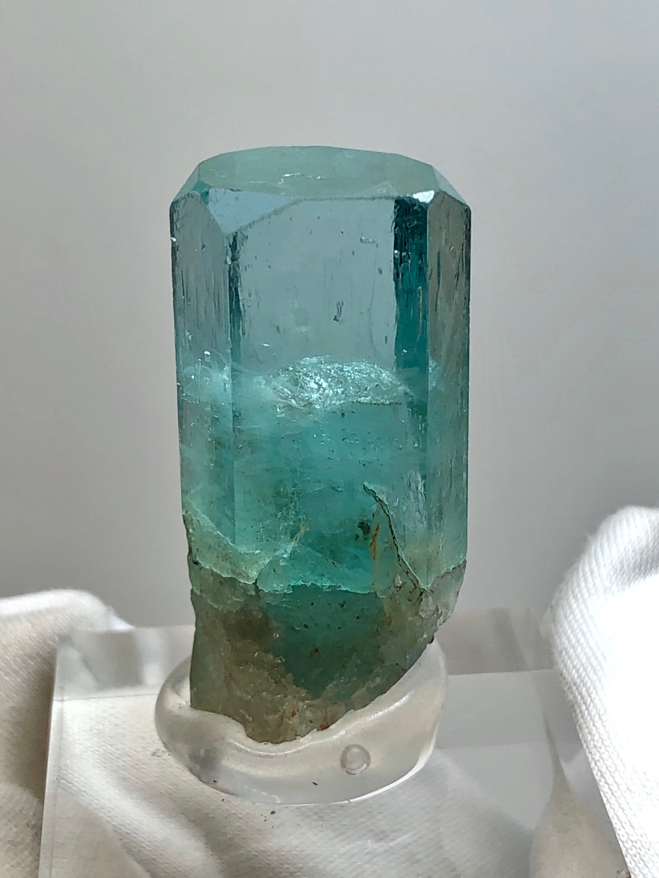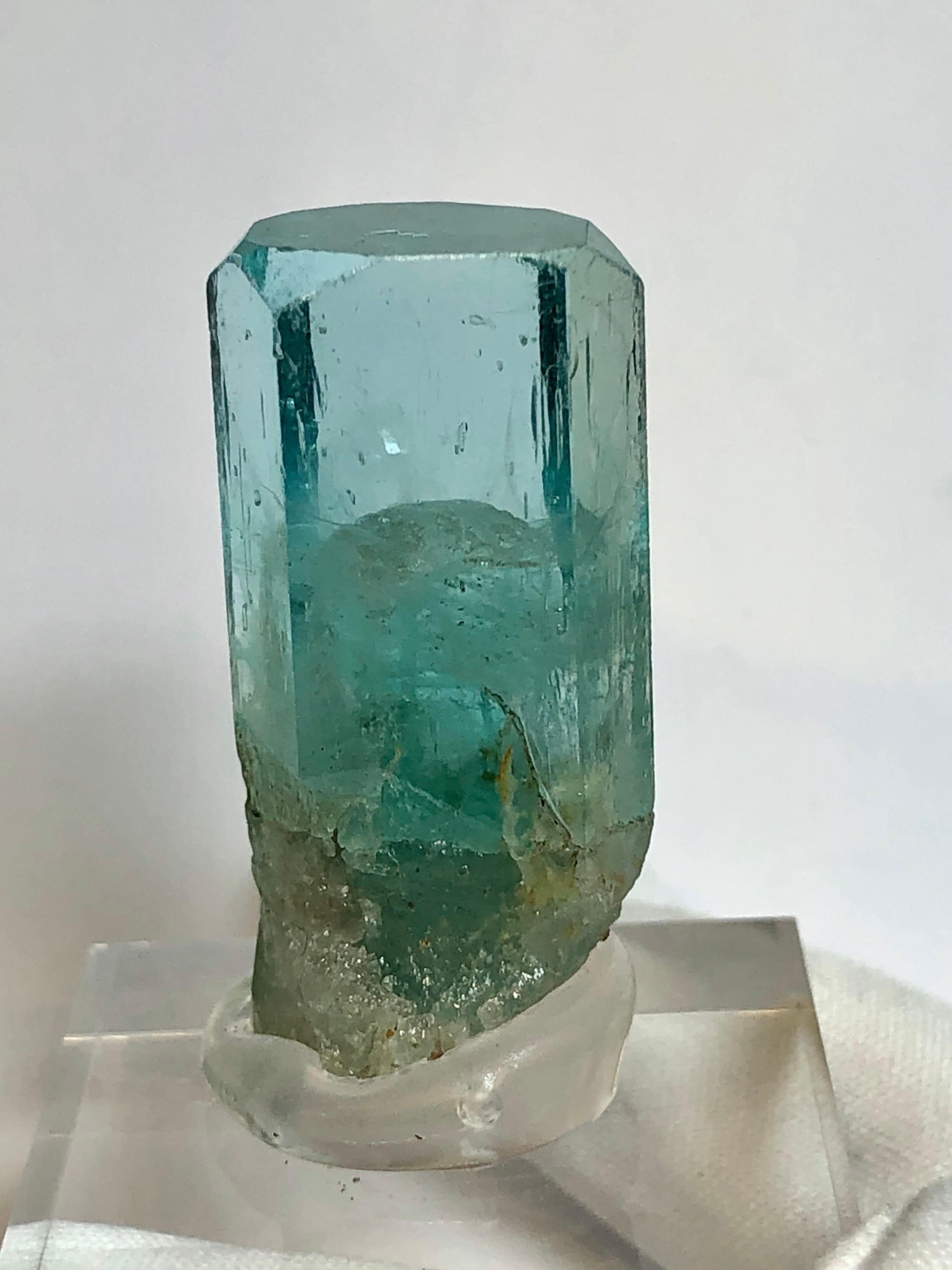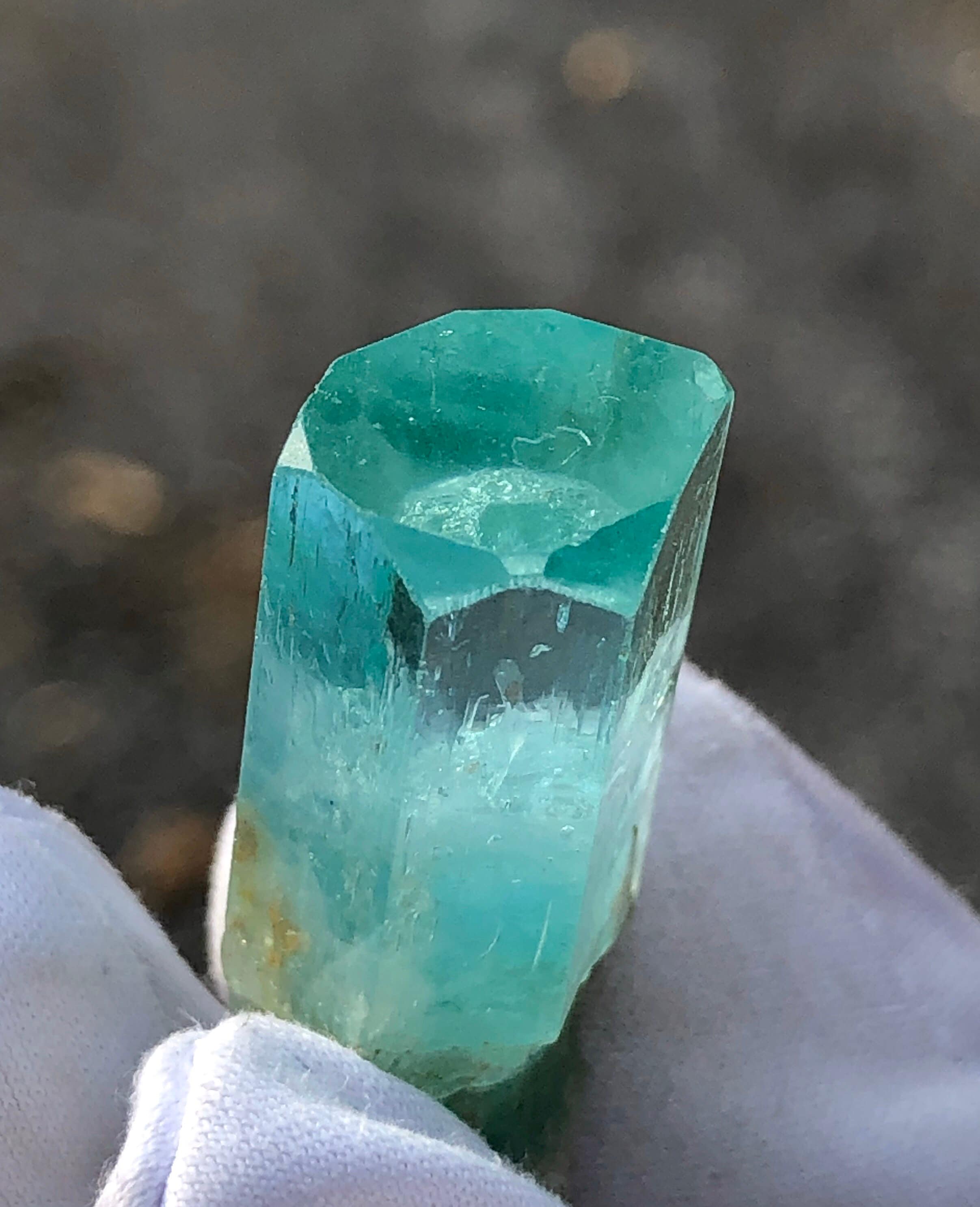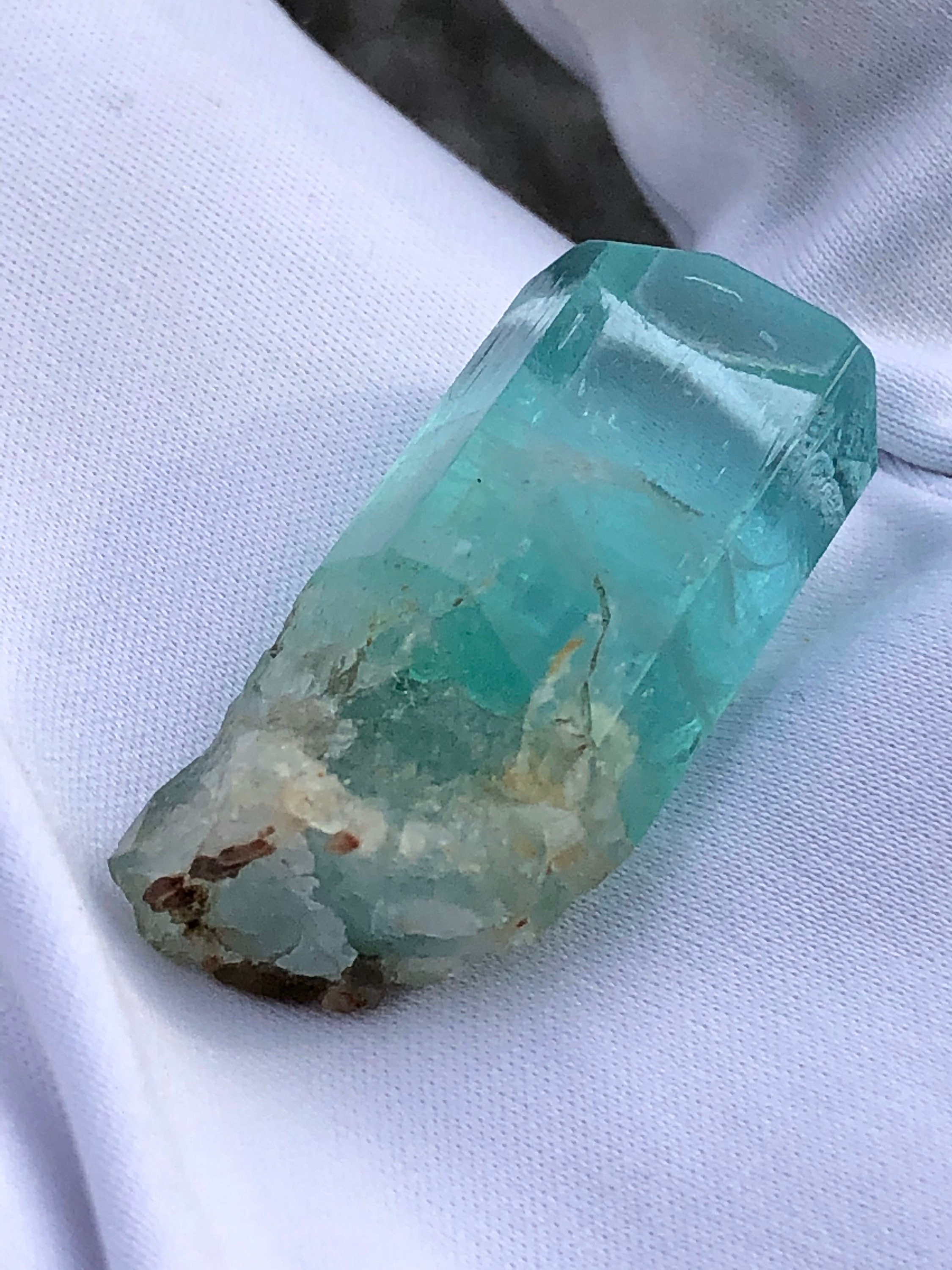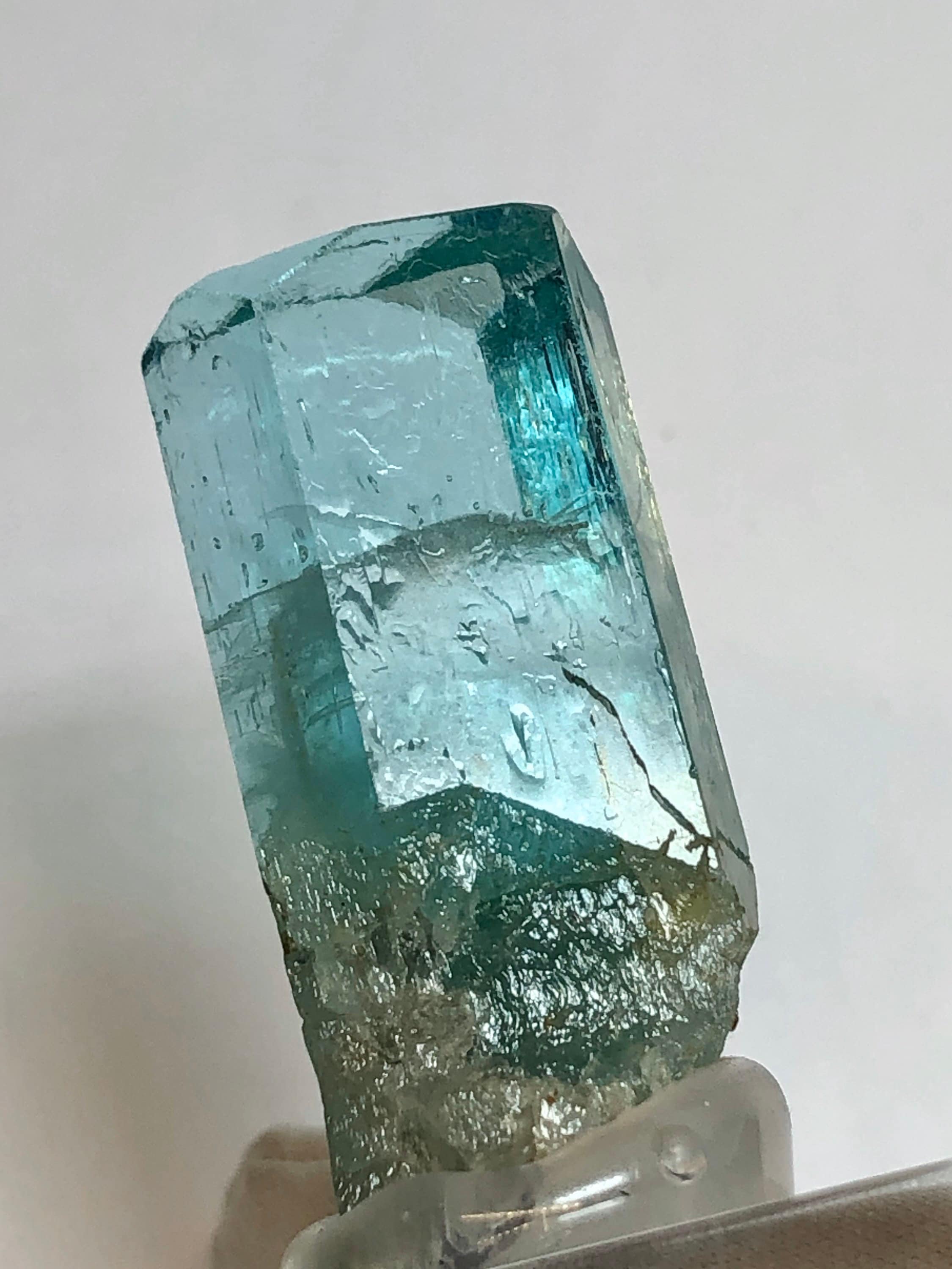 This listing is for the Exact Beryl crystal shown in the photos. This is a Rare Lagoon Beryl from Madagascar. It weighs 10.2 grams / 51 carats and measures 33.33 mm long end-to-end, 14.07mm side to side, and 11.28mm thick. This variety is highly sought and rarely available due to most clear crystals being cut into blue-green gemstones. These particular Madagascan beryls are said to contain chromium and vanadium. I’ve witnessed some parts of this crystal turn red when under strong uv light. The top termination looks great with an open c-axis revealing what lies beneath. The pyramidal pinacoid phantom inside of the main crystal has a soccer ball type of appearance, and is hexagonal as well. The bottom of this crystal is naturally etched with a few tiny red hematoid Quartz crystals who’s terminations naturally sync into the lagoon beryls morphology. This is a beautiful specimen. The Metaphysical value of this special crystal is astounding. Shifting from blue to green, spearmint and peppermint it seems, This is a heart / throat chakra activation Crystal, which is excellent for aligning the inner voice of the heart with the outer voice of self expression. The Hexagon has to do with Saturn and Karma. This crystal could assist in Karmic clearing. It has a strong Metaphysical presence, which is why I have held it in my collection for so long. Feel free to contact me with questions. Thanks for looking at my listing!