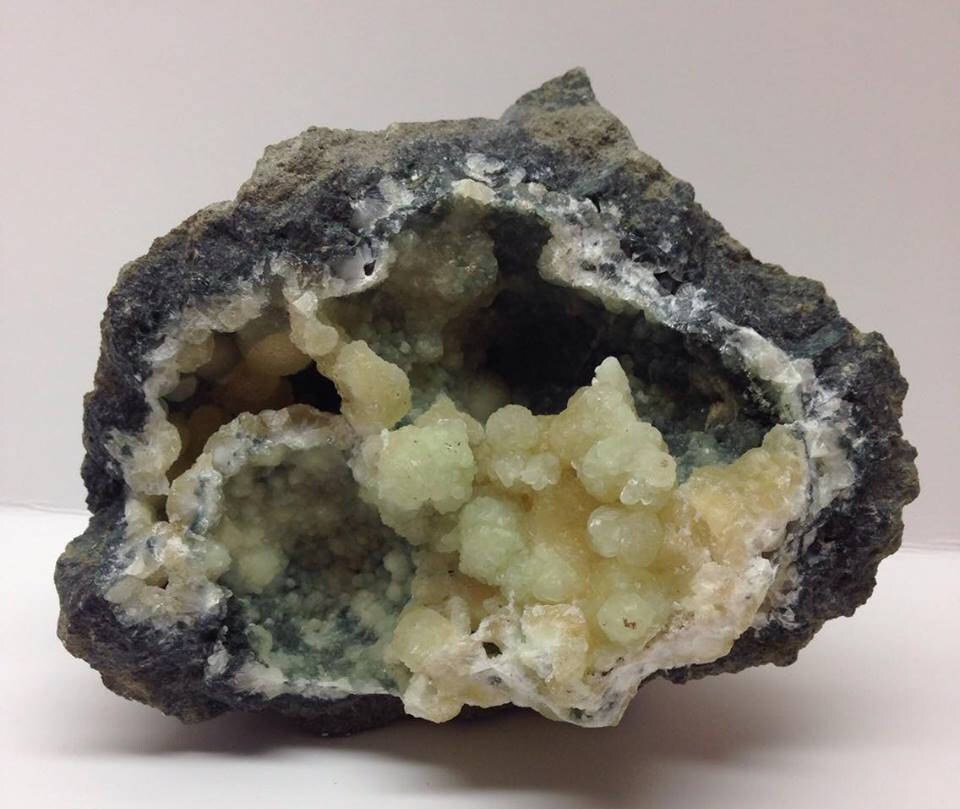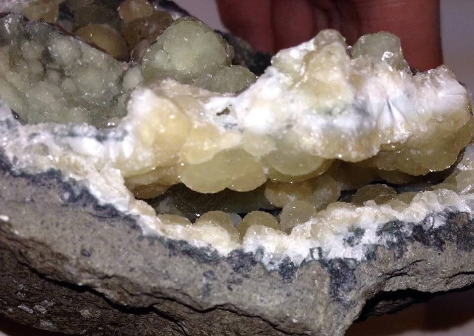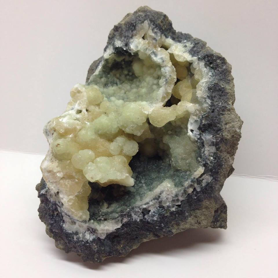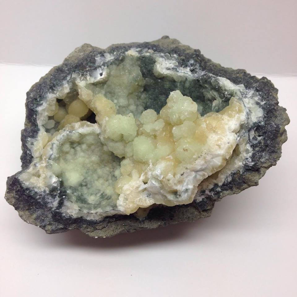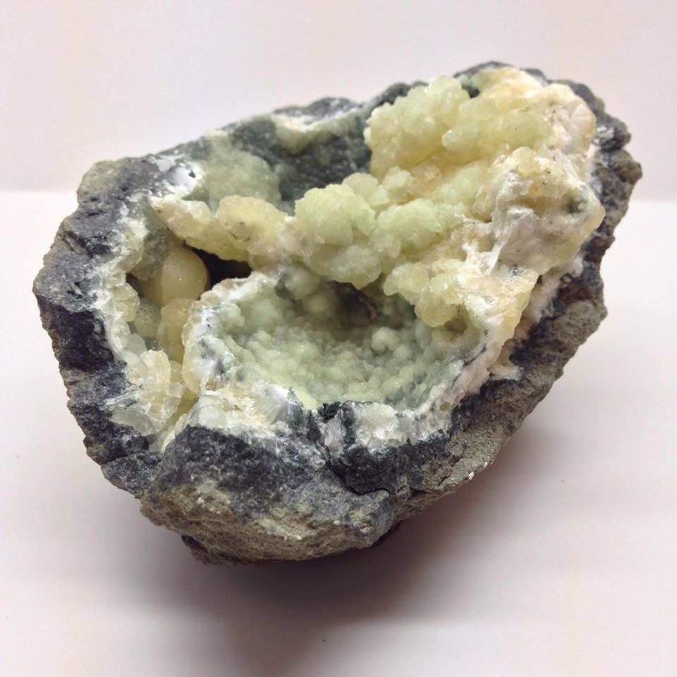 This listing is for the exact Prehnite cluster in the photos. This particular piece weighs 483.3 grams or 1.0654941 pounds and measures approximately 4.5 inches across. This is one of our favorite Prehnite specimens. It has a plethora of green and yellow Botryoidal nodules that zone in and out all throughout this Geode style Display specimen. The Prehnite crystals range in size. This piece is dynamic. It has good aesthetics and makes for an ideal display specimen. In my opinion the most gemmy and beautiful crystals are located within the deep vug cavity. This area is shown in the 5th photo. This amazing piece just blends so well with our collection here at home, and I'm confident that the next keeper will also have this satisfaction. It really is a phenomenally attractive "specimen". Listed below is Metaphysical information regarding Prehnite. Please don't hesitate to contact me with any questions you have. Thanks for looking at my listing! Be free to view the others while you're at my shop.