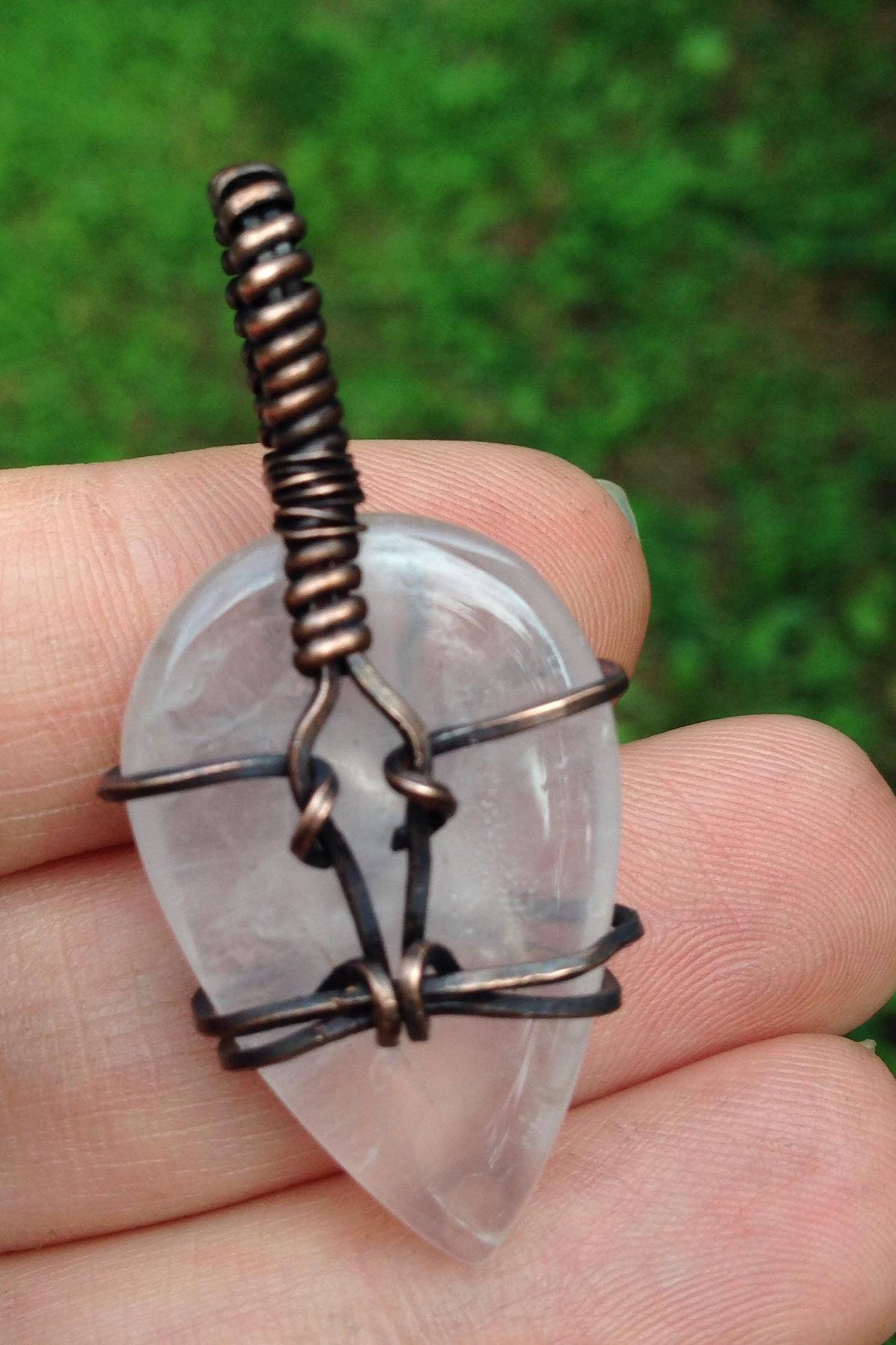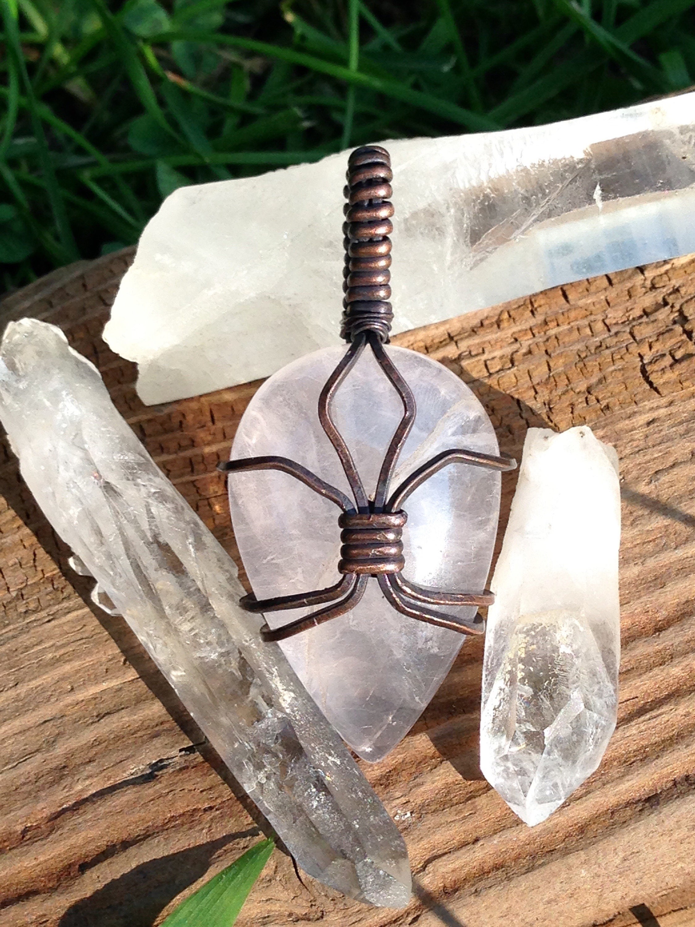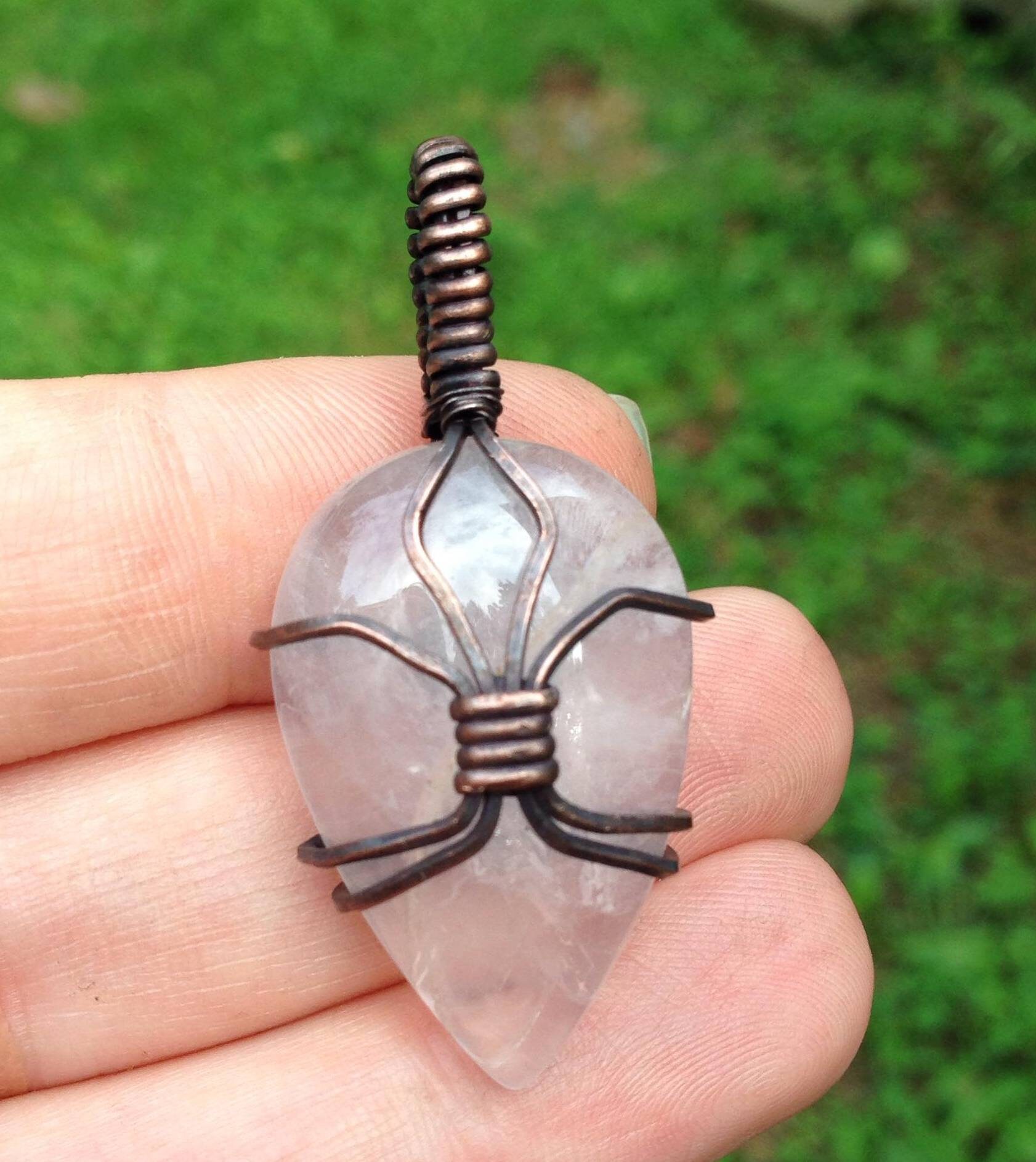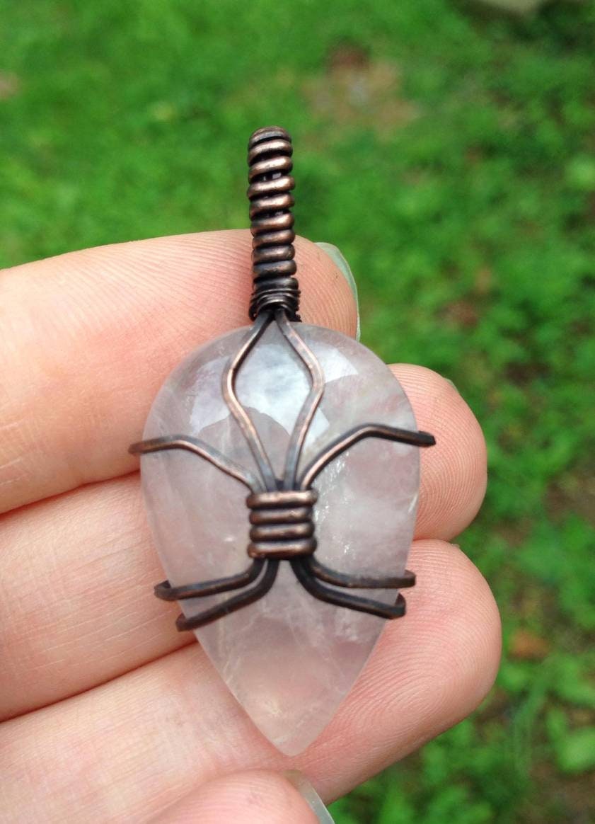 This listing is for the exact pendant shown in the photos. This pendant features a Rose Quartz cabochon wrapped in copper wire, which has been oxidized. 45mm tall x 20mm wide. Use the variation option to choose a brown or black faux leather cord .