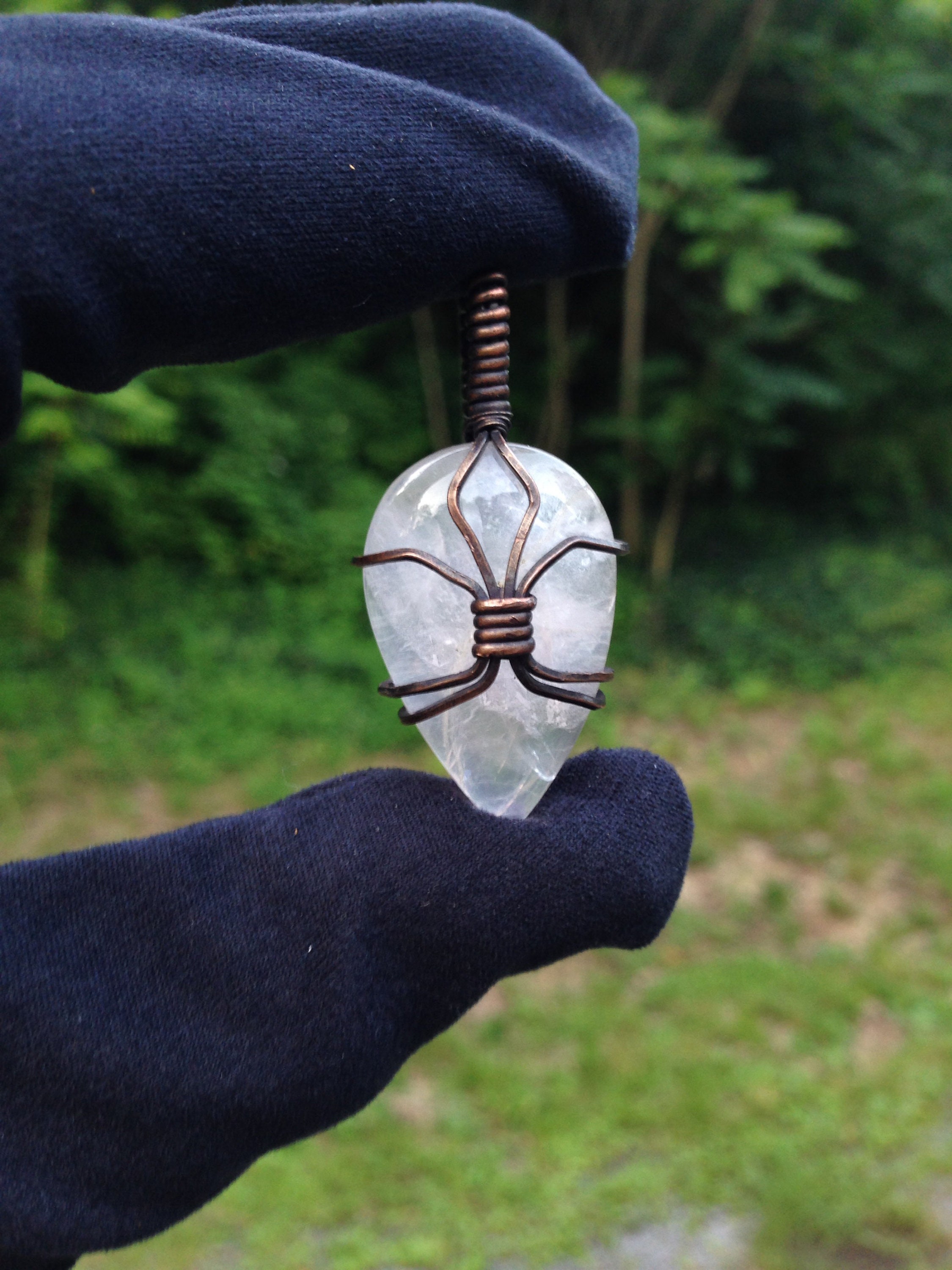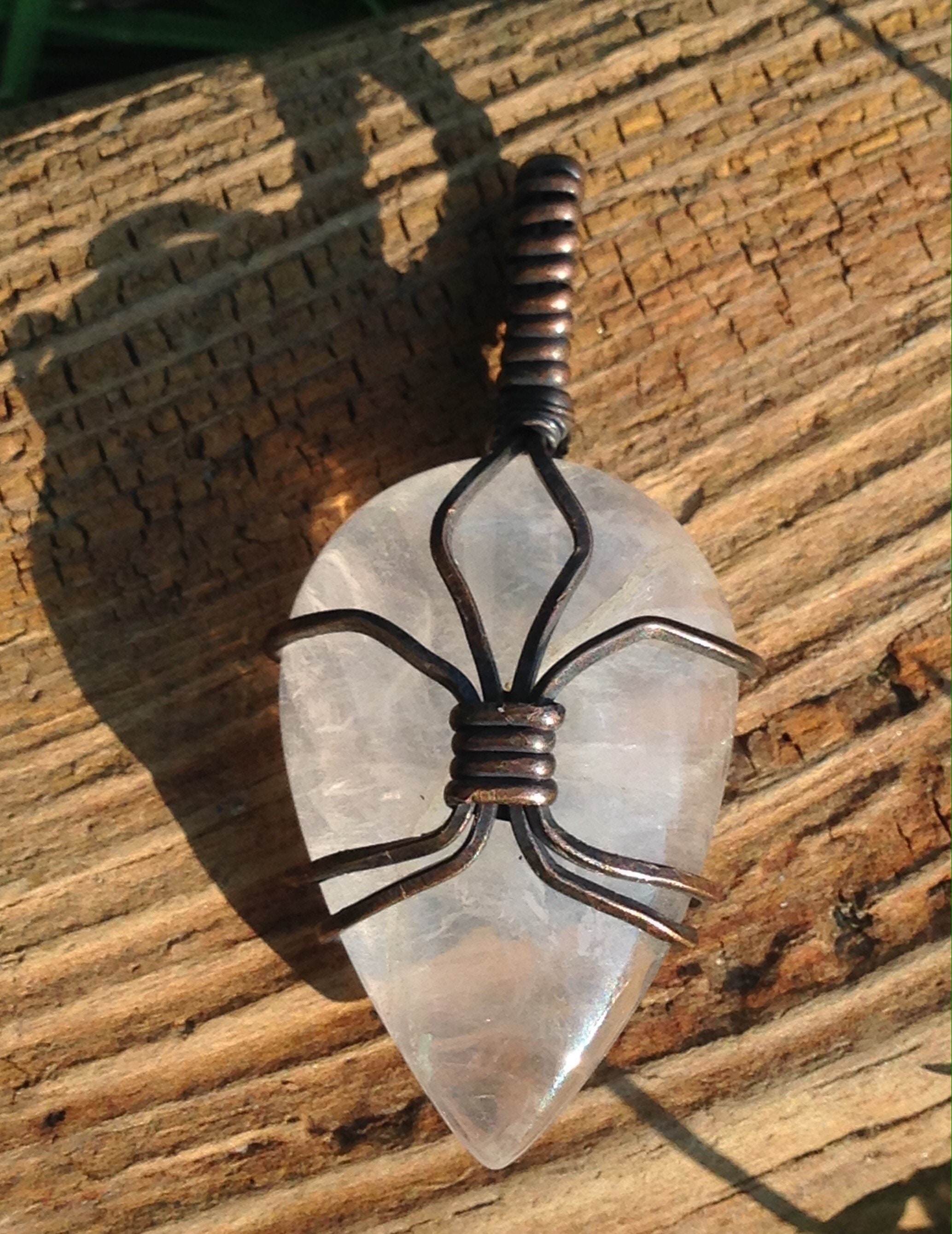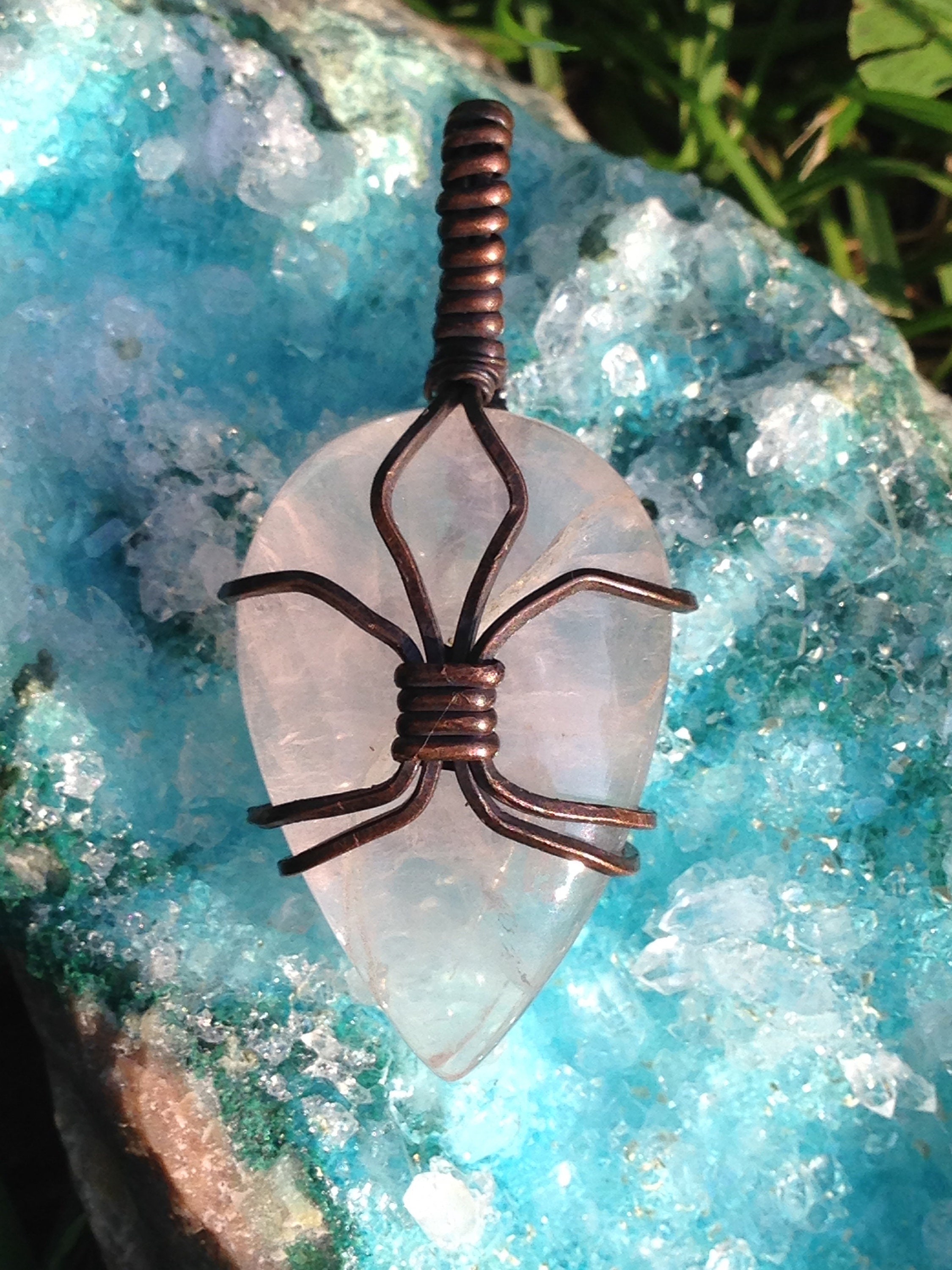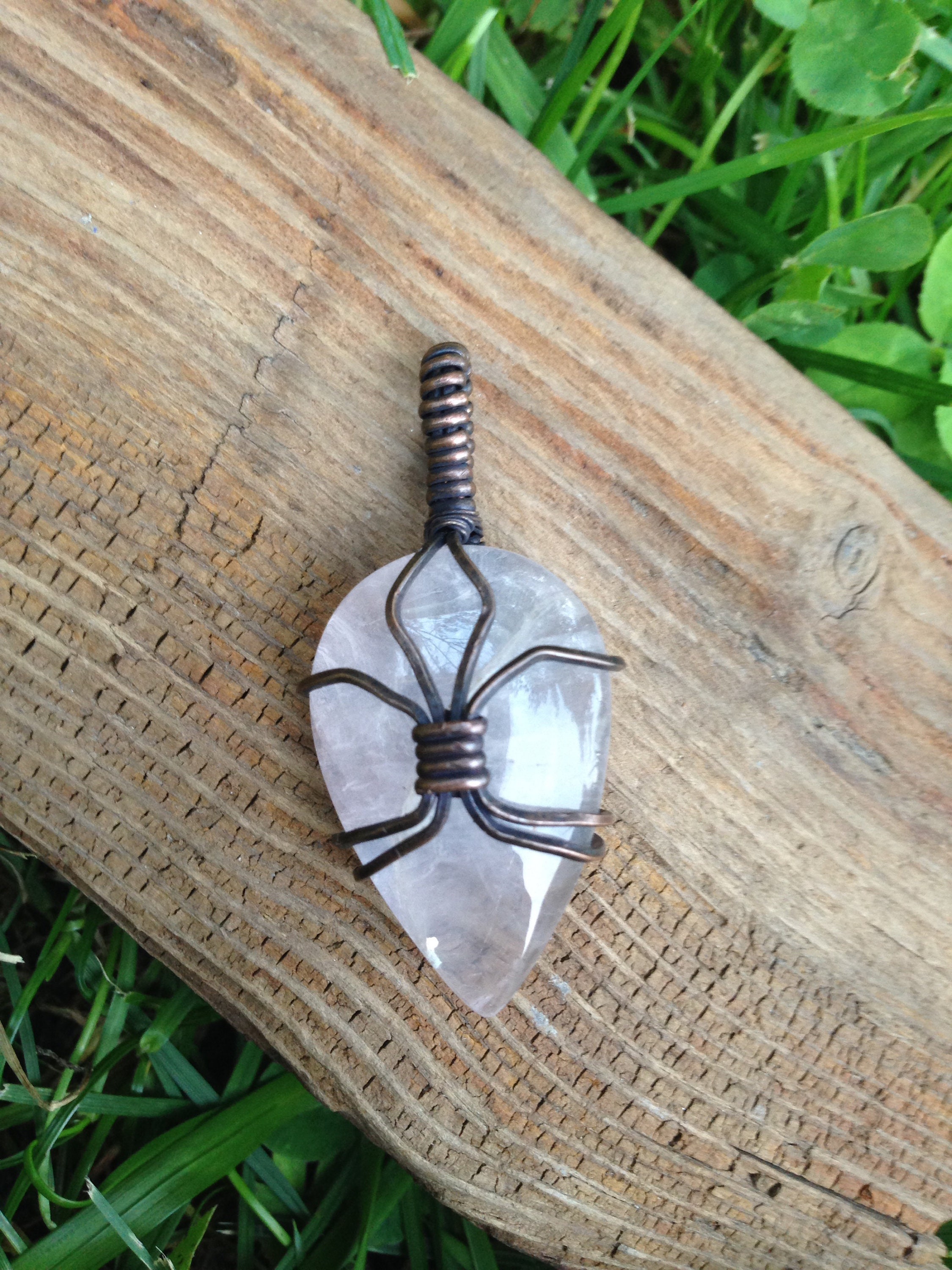 This listing is for the exact pendant shown in the photos. This pendant features a Rose Quartz cabochon wrapped in copper wire, which has been oxidized. 45mm tall x 20mm wide. Use the variation option to choose a brown or black faux leather cord .