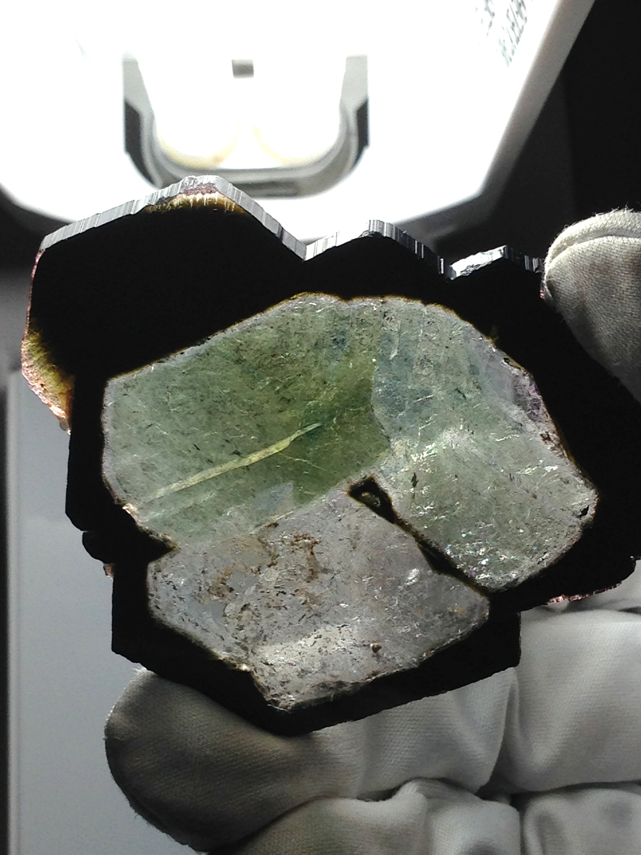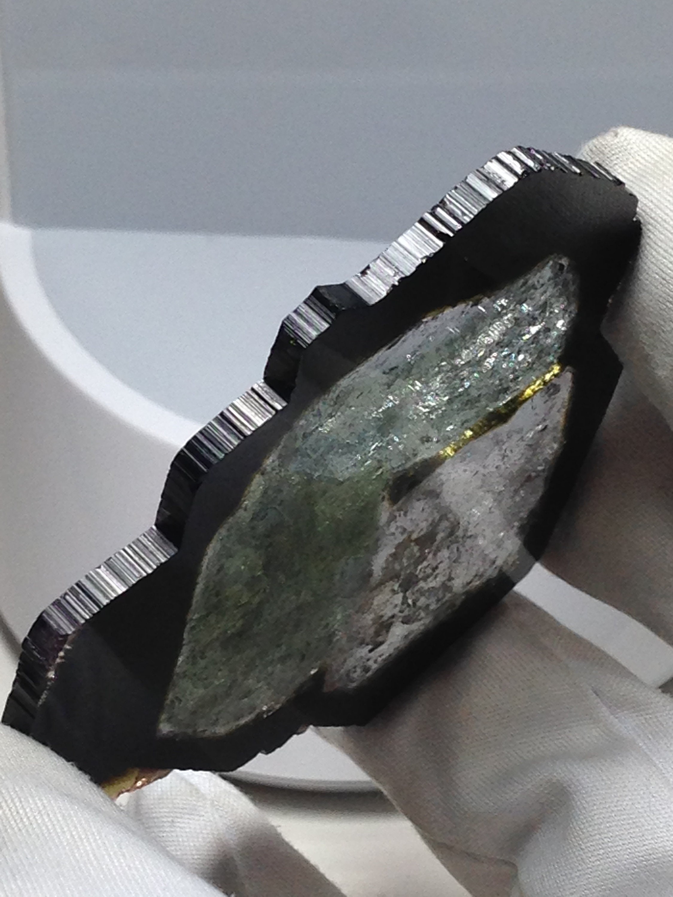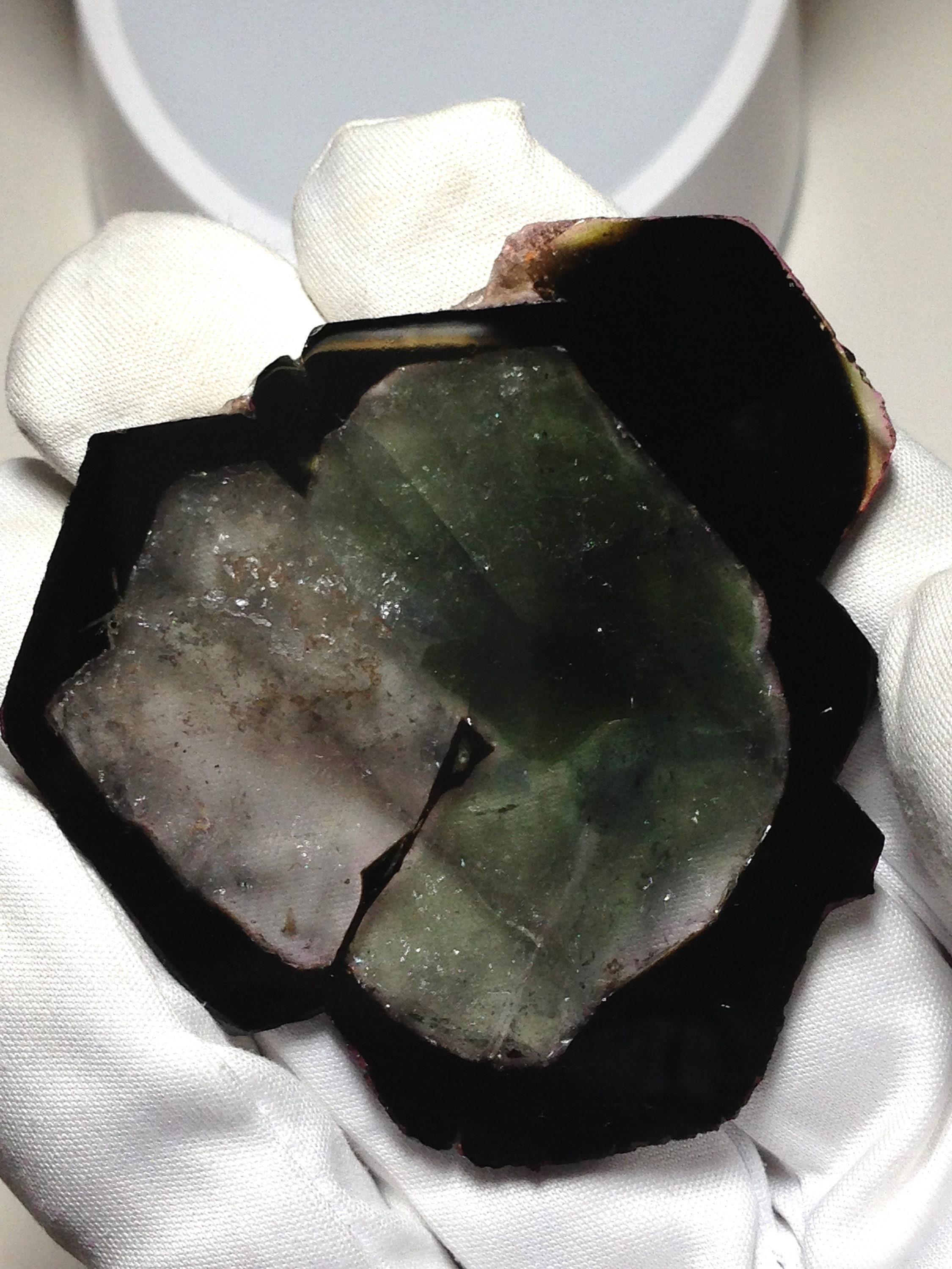 This is the Largest Madagascar Tourmaline slice on our website, and it is also the biggest one on etsy too. It comes from a classic old collection of top quality mineral specimens. This Liddicoatite slice weighs 24.9 grams / 124.5 carats and measures over 2.5 inches in diameter. It is unique in several respects. Firstly, this is a complete crystal slice. All sides are complete. Secondly, the most prominent color within the central sectors is a mossy forest green, surrounded and neighbored by an extremely light pink tinge. Most of the core has superb clarity. The mantle region of the slice is a translucent to opaque dark green that appears almost as black if not viewed with a revealing light source. Some greenish yellow and pink saturation is visible along parts of the outer region / rind of the slice. This particular tourmaline slice was originally purchased from The Great Spiral Gallery, which was a Museum / Shop in California that is no longer in business. Feel free to contact me with questions. Thanks for looking!
