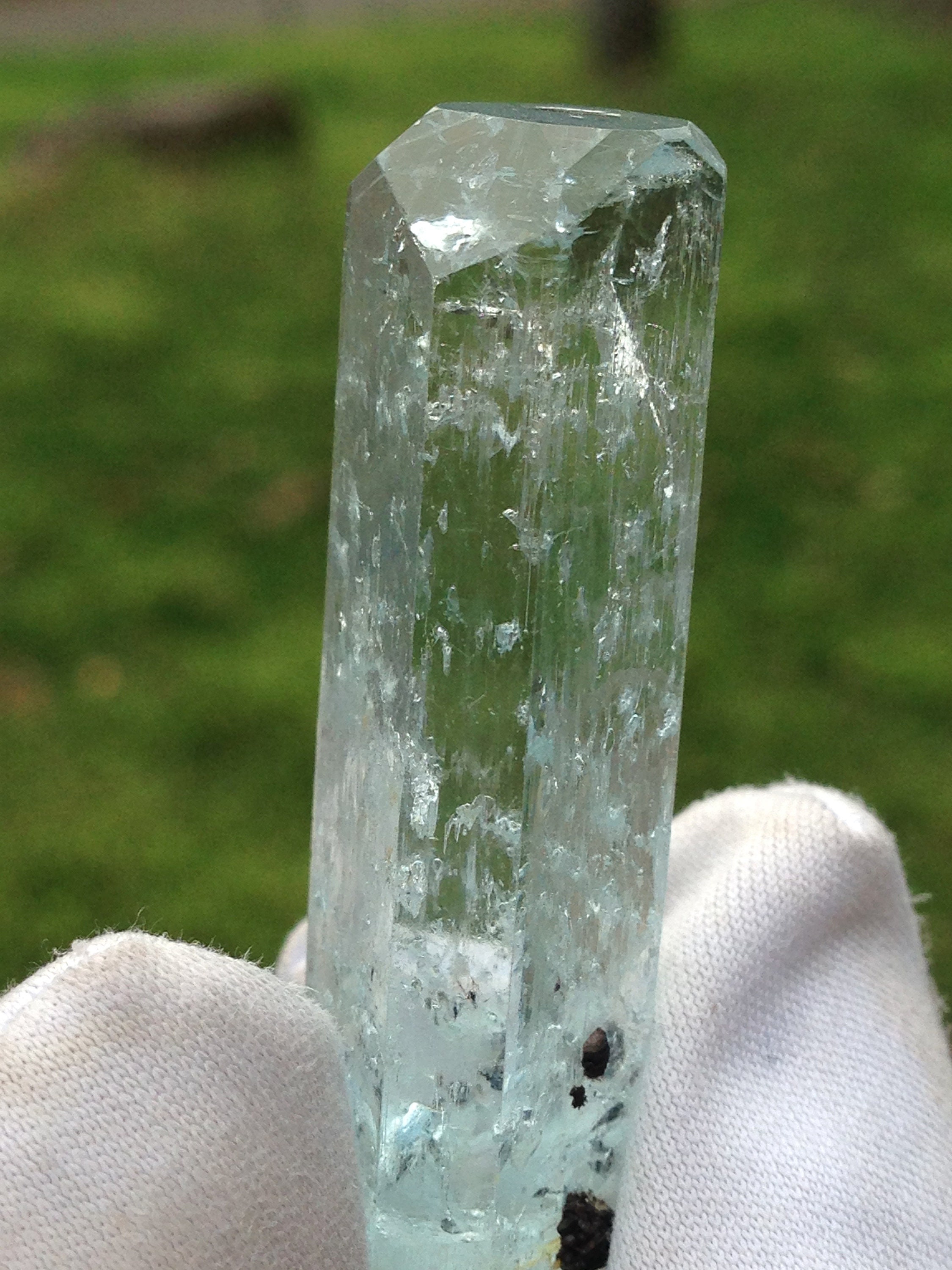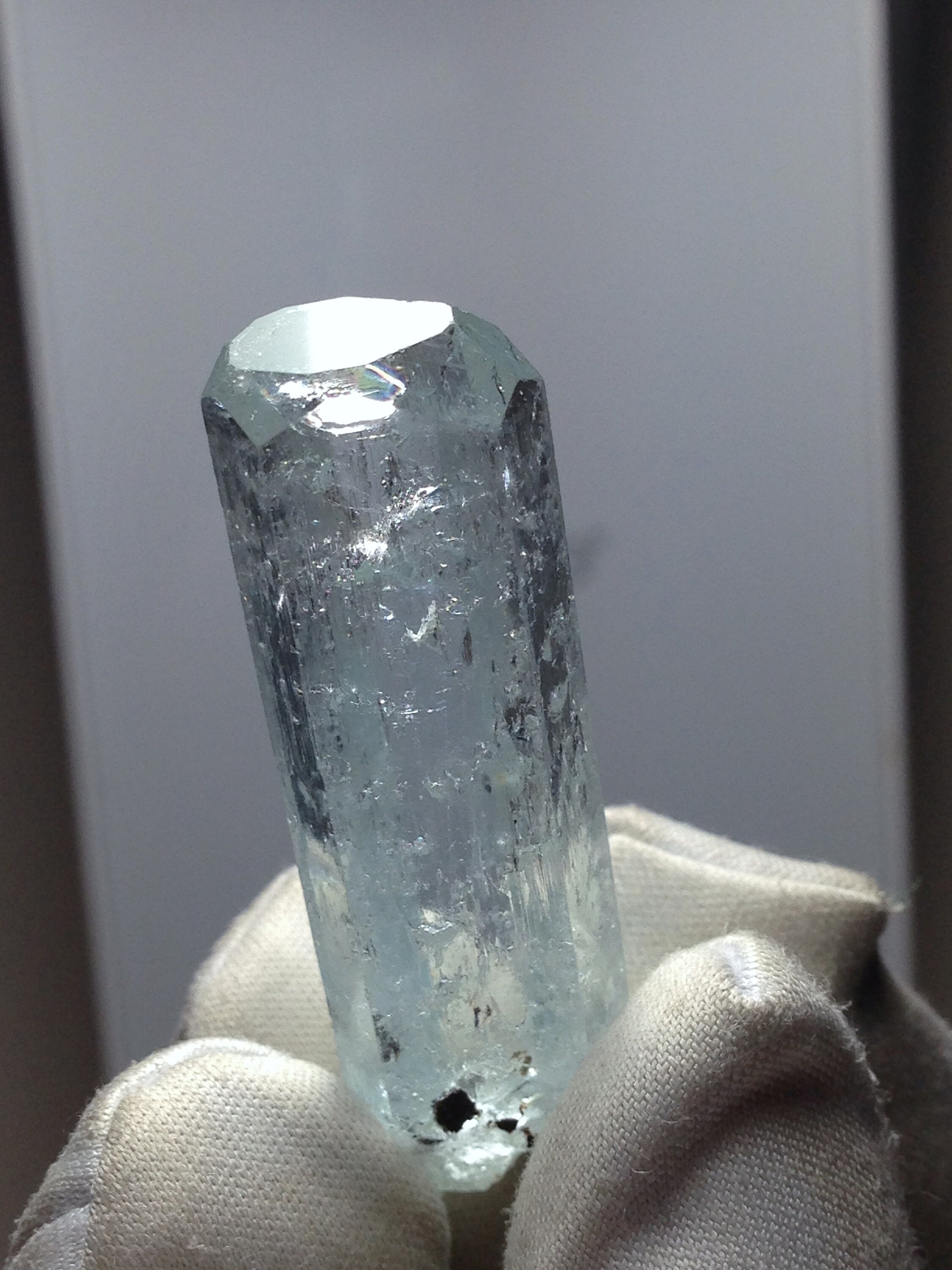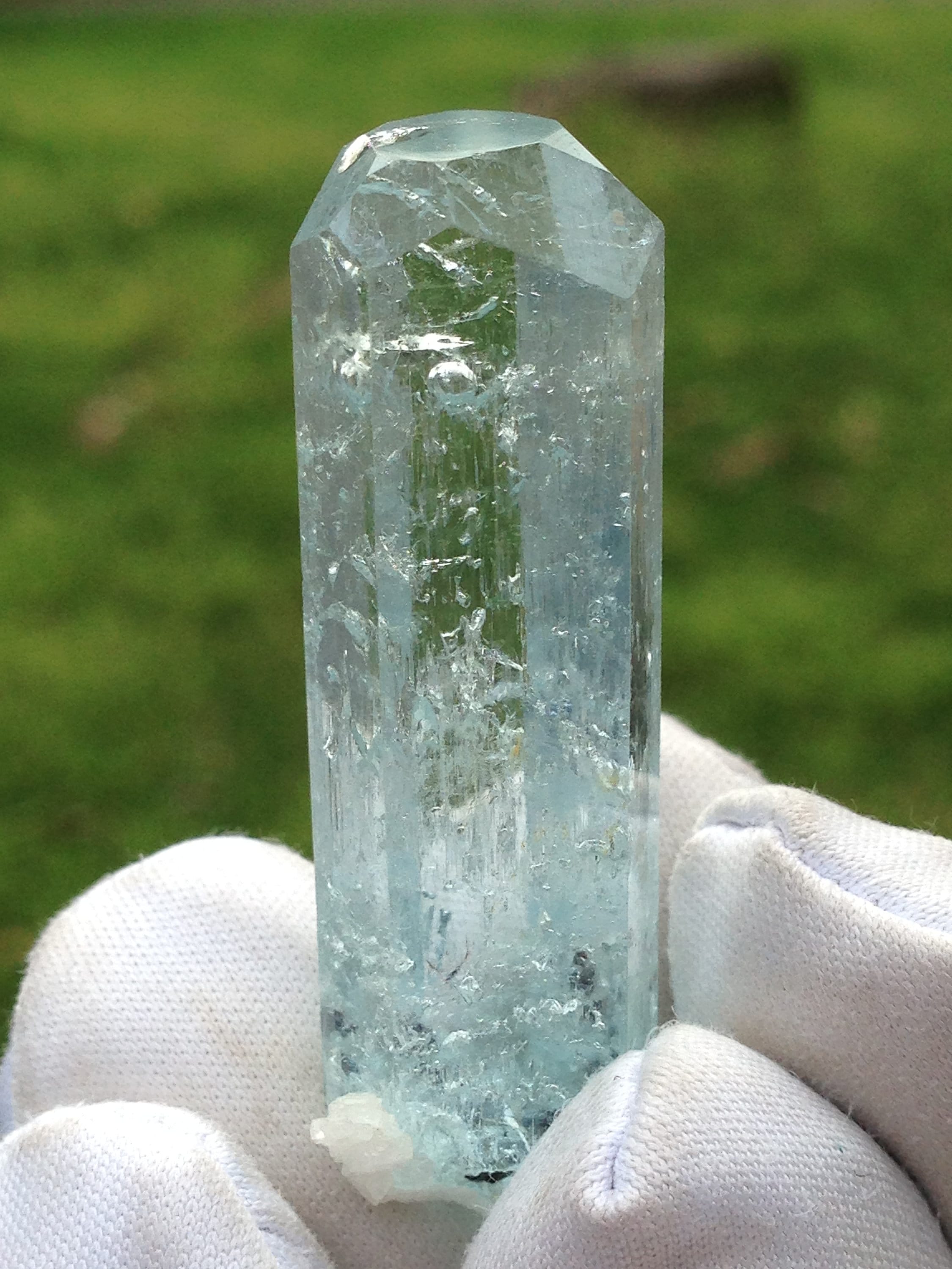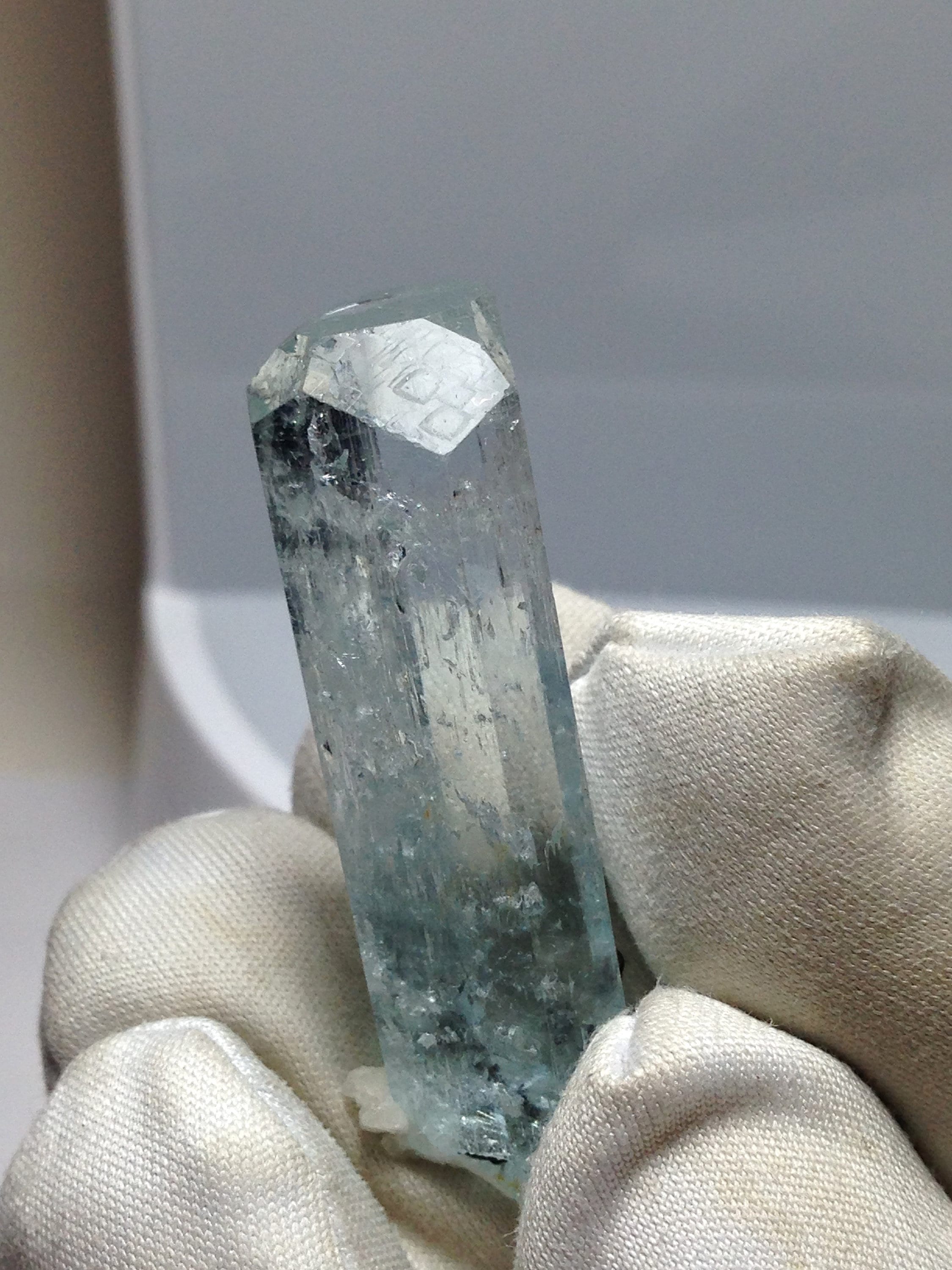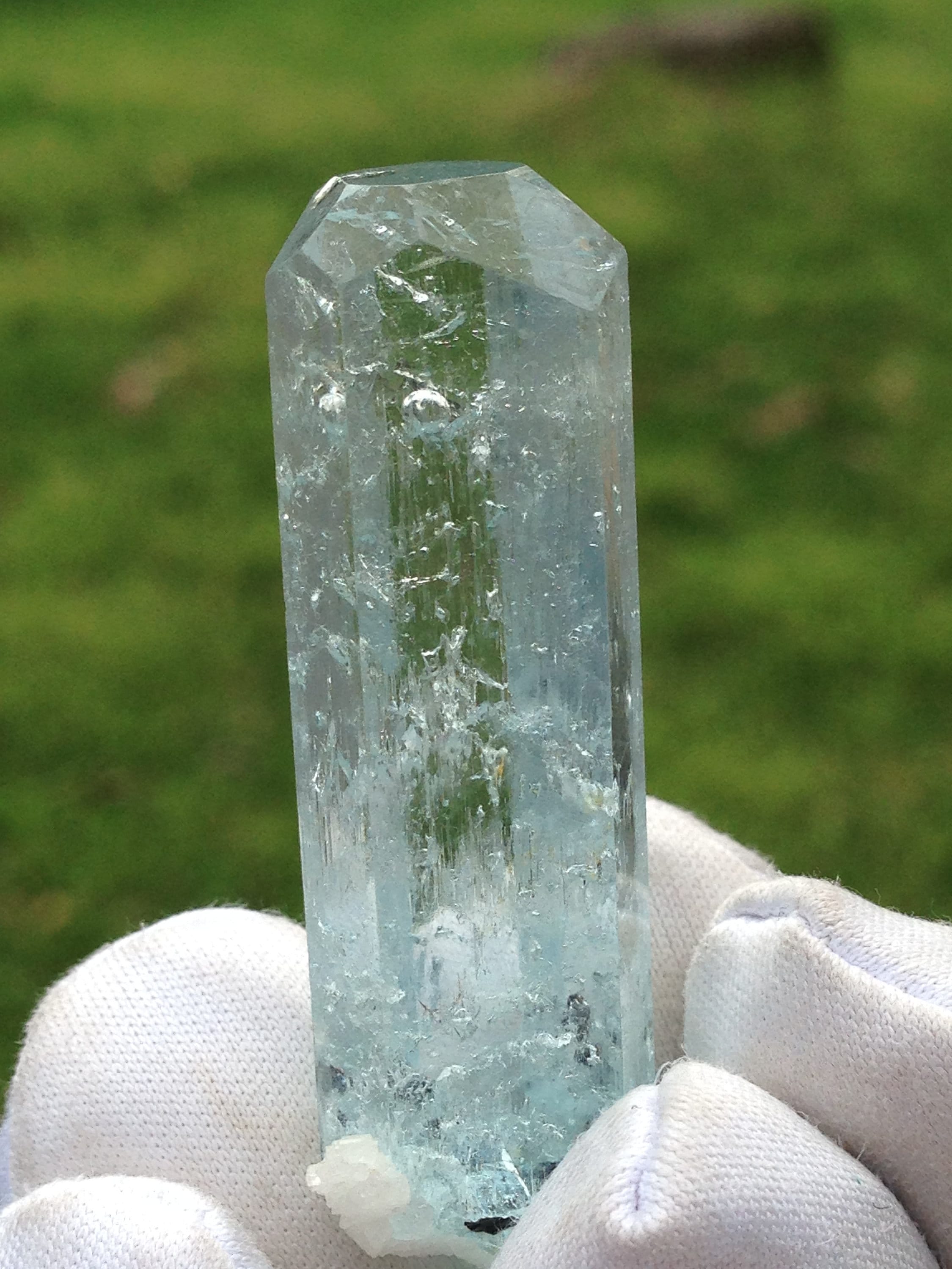This Aquamarine, while from the popular and abundant locality of Pakistan, is in Rare form. This fabulous Enhydro Aquamarine crystal weighs a nice 11.27 grams / 56.35 carats and measures 44.03mm x 11.36mm x 11.14mm. It is very attractive with superb clarity and Unique etchings on most of the crystal faces; including some "raised-up" layered record keeper etchings on the termination faces. The termination is fancy with an open c-axis that allows one to look down it to observe some black tourmaline and albite inclusions inside the bottom of the crystal. Hollow tubes are present just beneath the skin of the crystal. These look like micro-enhydro chambers. There is one moving enhydro inside of this piece. The enhydro bubble gets stuck and requires some palm pounding and shaking to dislodge it. If you're set on an enhydro that gracefully jumps from one point to another with ease, then I suggest holding off because this one is stubborn. Yet it is beautiful and amazing. Enhydro Aquamarine crystals are pretty rare. This is the second one that we've ever sold. The bottom of this crystal is not terminated, although it does have some smaller healed parts. This Aqua has zero damages! Rainbows can be observed right beneath the Termination (see photo#3). The record keeper etchings are shown in photos #2 & #8. These raised etchings are best seen in person with light reflected from the faces. The big old stubborn enhydro is shown moving in the beginning of both facebook videos, as well as in photos #1, #7, and #8. The bubble is large in comparison to the other natural inclusions within this gemmy aqua. The symmetry of this piece is a real treat. The prism faces evenly alternate from skinny to wide, creating a Diamond-like shape when viewed from the c-axis. Feel free to contact me with any questions you may have in regards to this fine light blue Aquamarine. Metaphysical information is listed below. Thanks for looking at my listing!