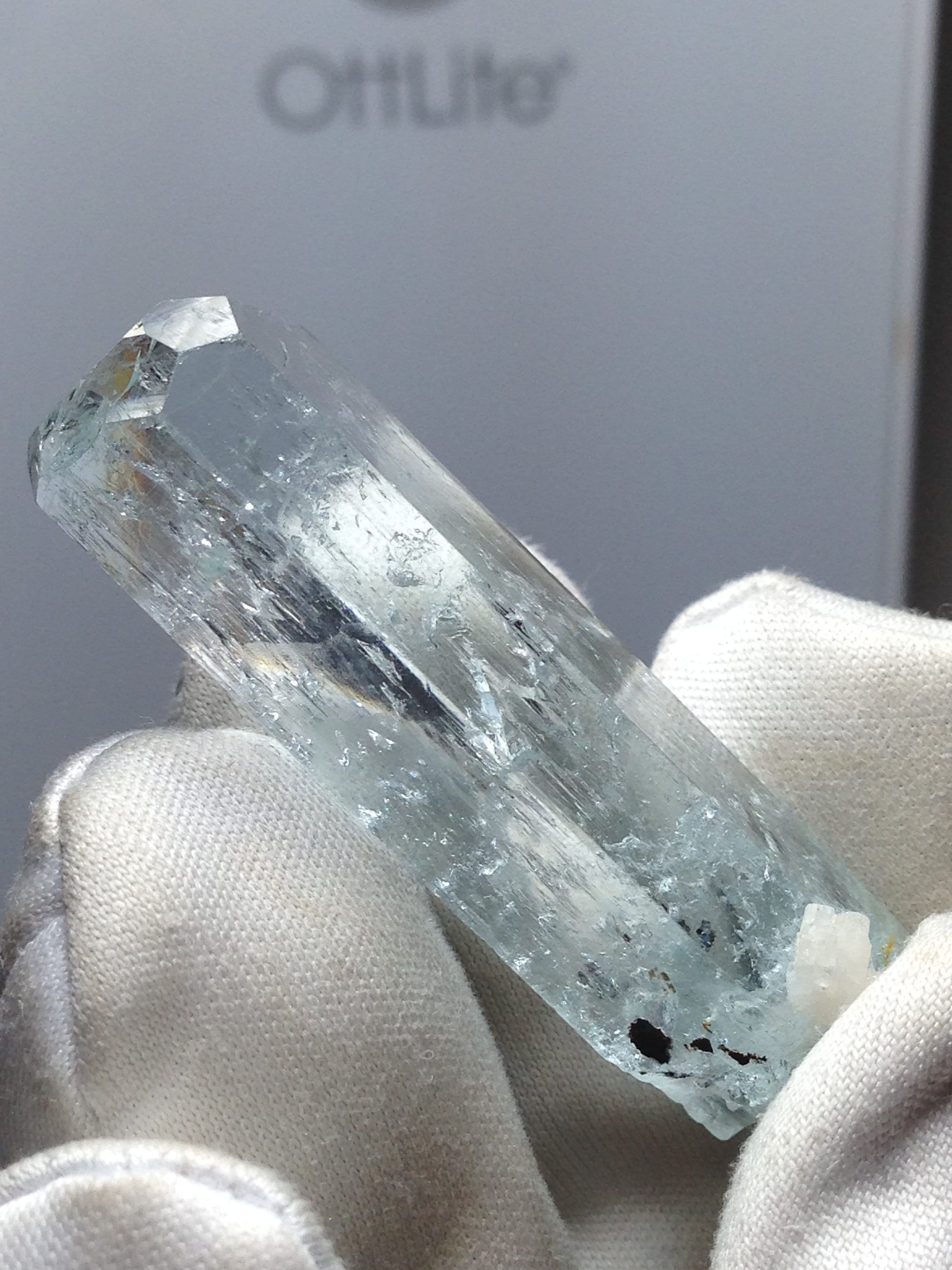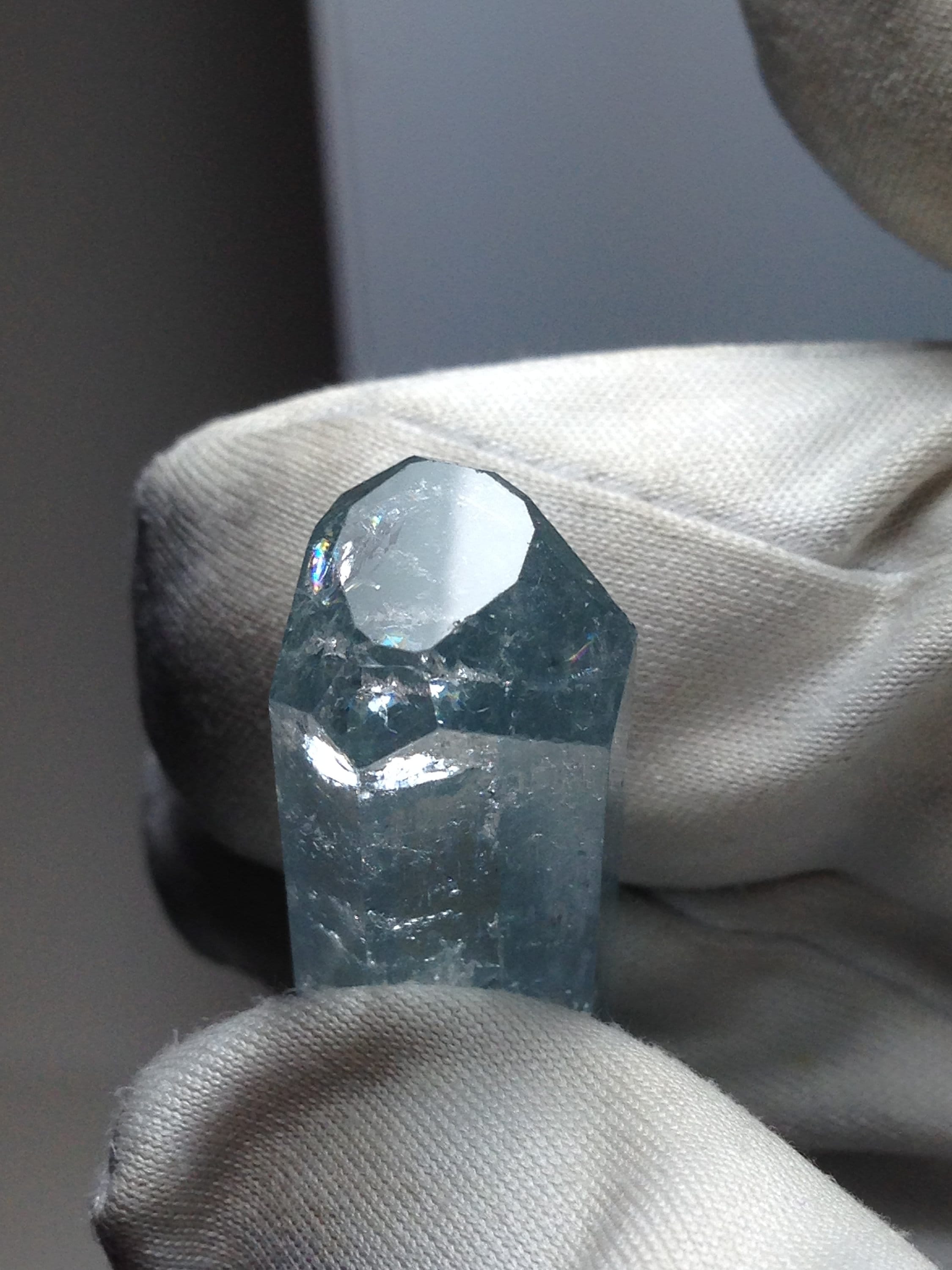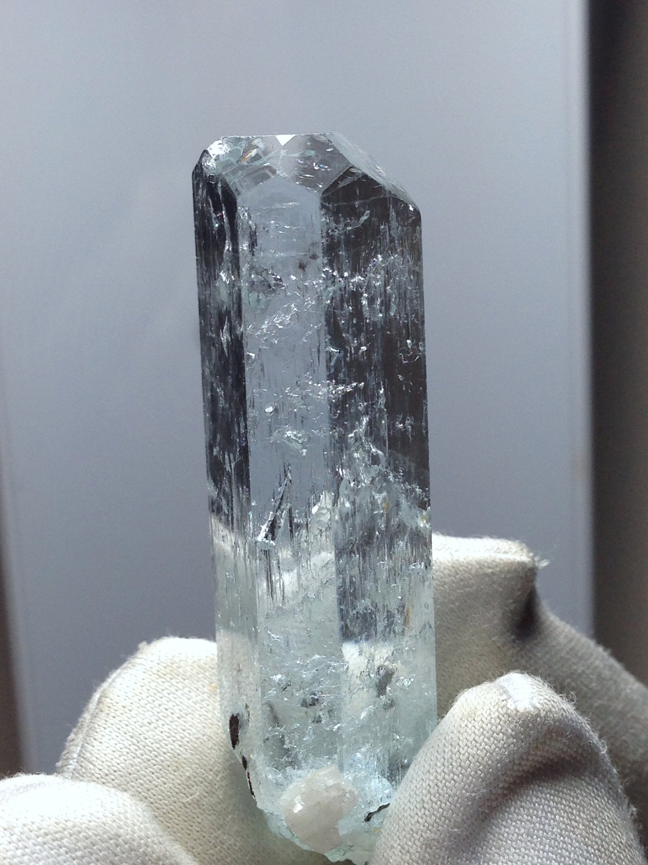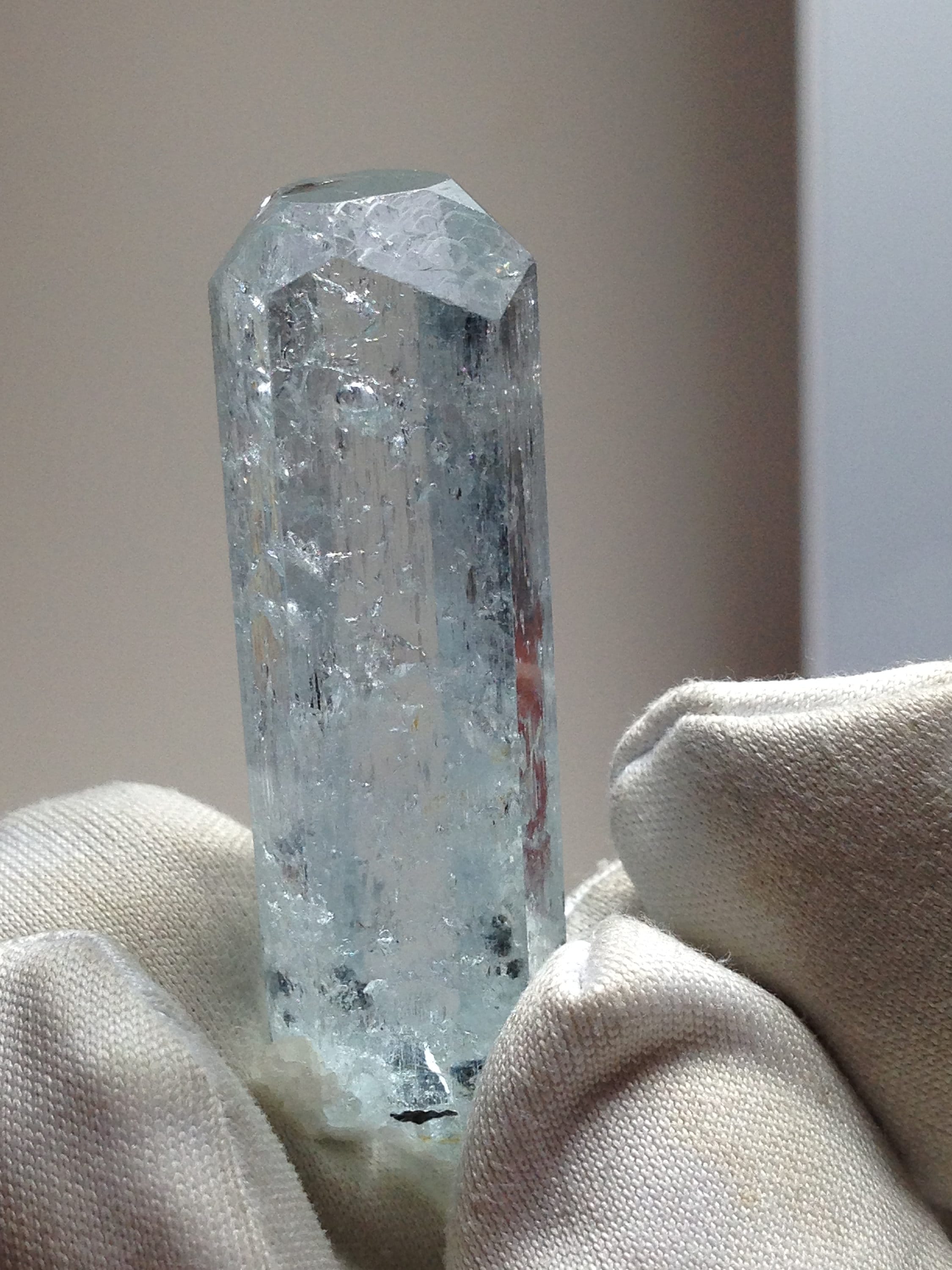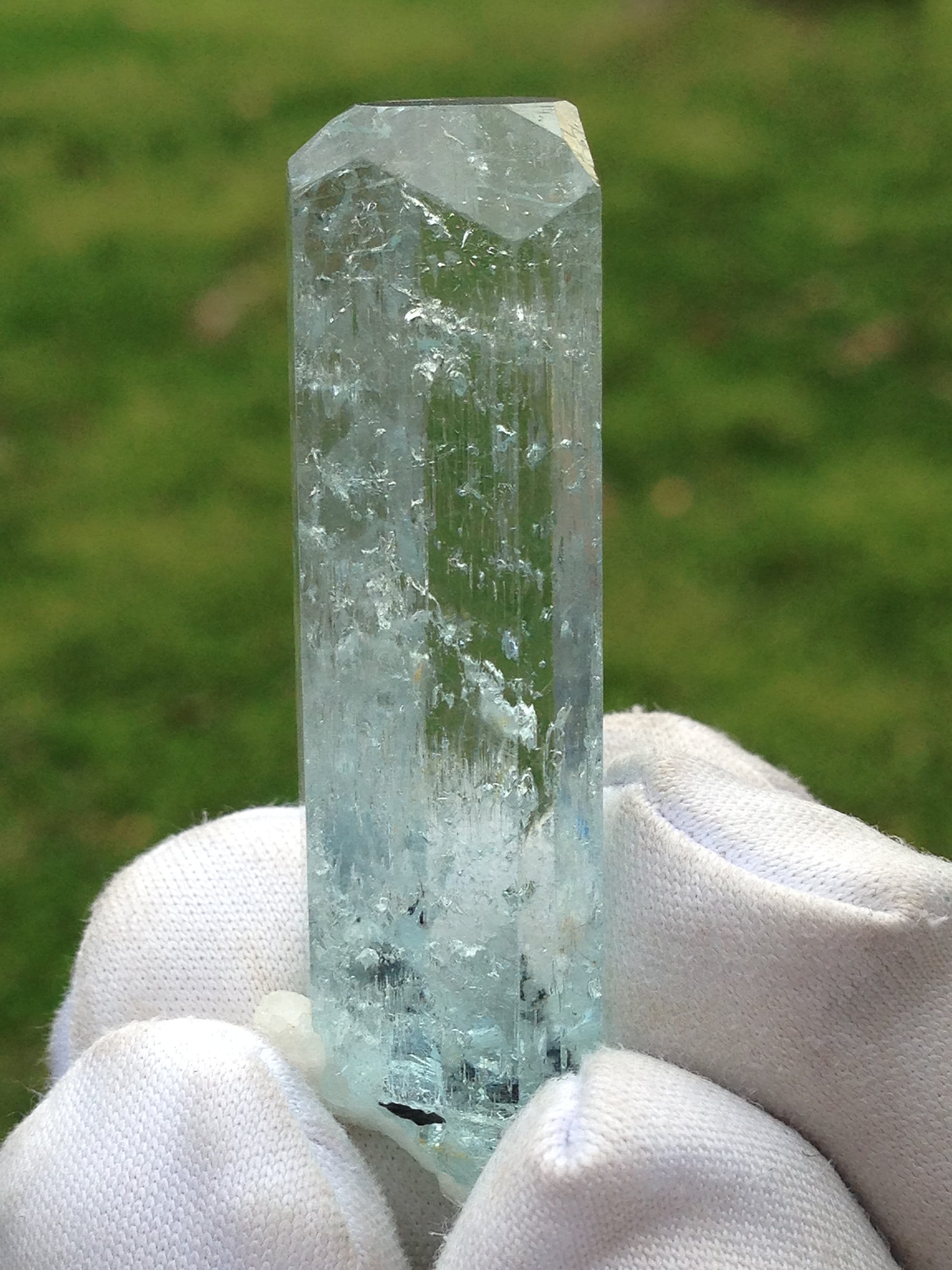 This Aquamarine, while from the popular and abundant locality of Pakistan, is in Rare form. This fabulous Enhydro Aquamarine crystal weighs a nice 11.27 grams / 56.35 carats and measures 44.03mm x 11.36mm x 11.14mm. It is very attractive with superb clarity and Unique etchings on most of the crystal faces; including some "raised-up" layered record keeper etchings on the termination faces. The termination is fancy with an open c-axis that allows one to look down it to observe some black tourmaline and albite inclusions inside the bottom of the crystal. Hollow tubes are present just beneath the skin of the crystal. These look like micro-enhydro chambers. There is one moving enhydro inside of this piece. The enhydro bubble gets stuck and requires some palm pounding and shaking to dislodge it. If you're set on an enhydro that gracefully jumps from one point to another with ease, then I suggest holding off because this one is stubborn. Yet it is beautiful and amazing. Enhydro Aquamarine crystals are pretty rare. This is the second one that we've ever sold. The bottom of this crystal is not terminated, although it does have some smaller healed parts. This Aqua has zero damages! Rainbows can be observed right beneath the Termination (see photo#3). The record keeper etchings are shown in photos #2 & #8. These raised etchings are best seen in person with light reflected from the faces. The big old stubborn enhydro is shown moving in the beginning of both facebook videos, as well as in photos #1, #7, and #8. The bubble is large in comparison to the other natural inclusions within this gemmy aqua. The symmetry of this piece is a real treat. The prism faces evenly alternate from skinny to wide, creating a Diamond-like shape when viewed from the c-axis. Feel free to contact me with any questions you may have in regards to this fine light blue Aquamarine. Metaphysical information is listed below. Thanks for looking at my listing!