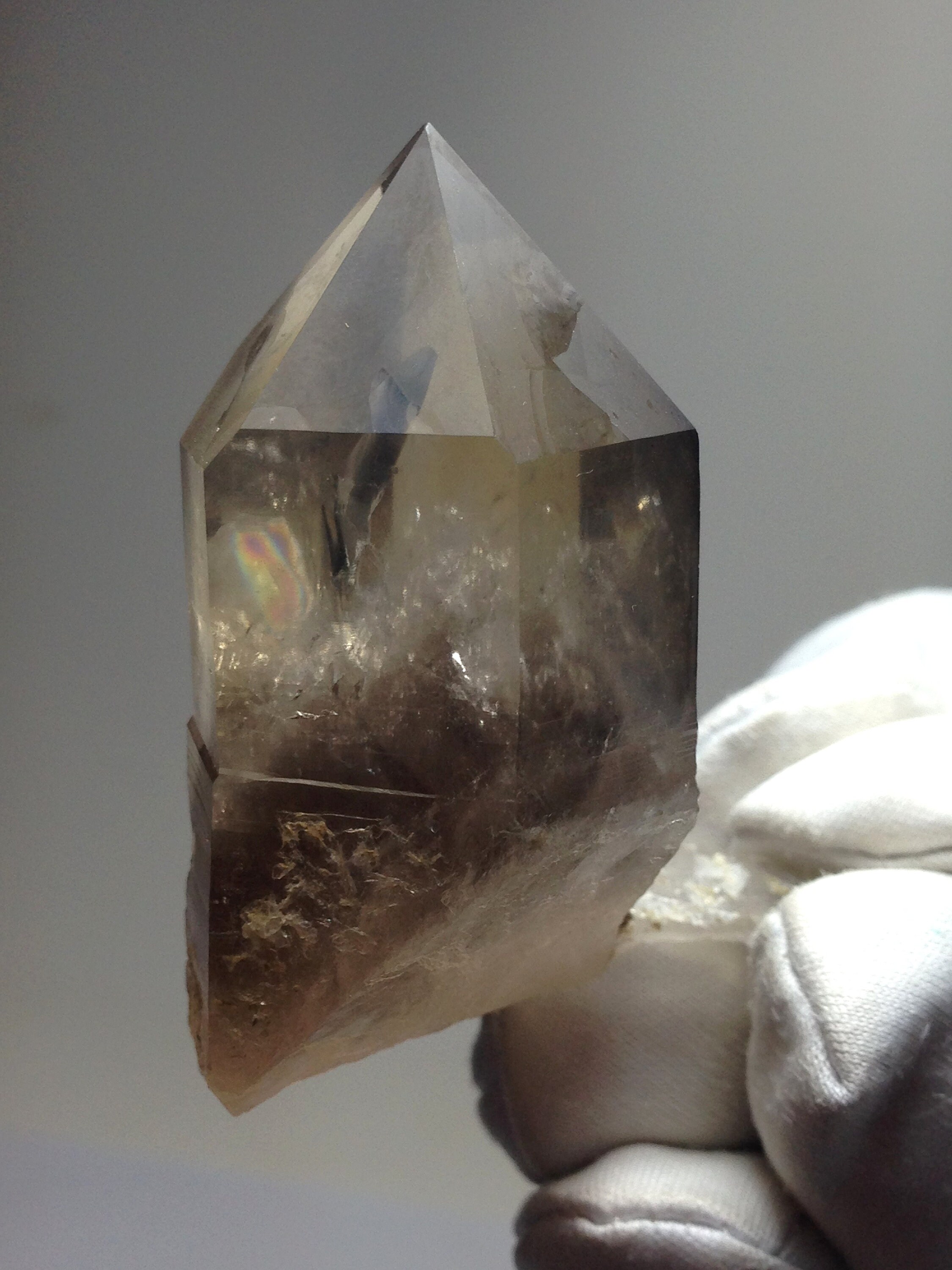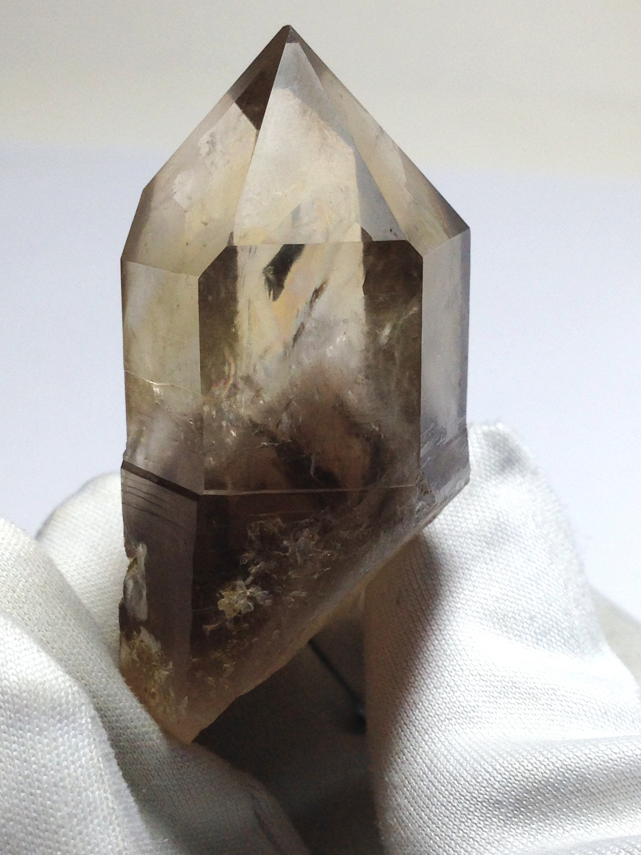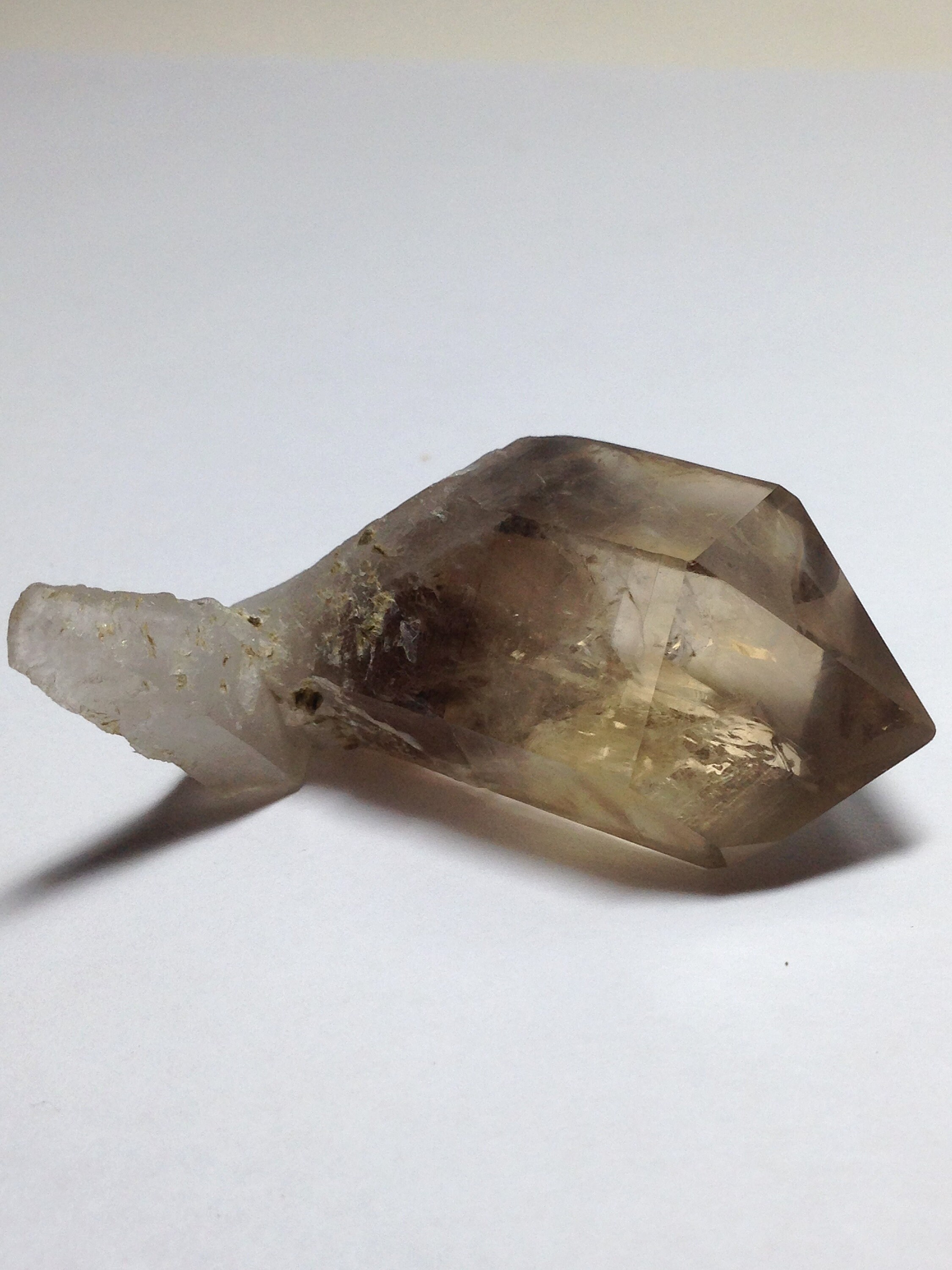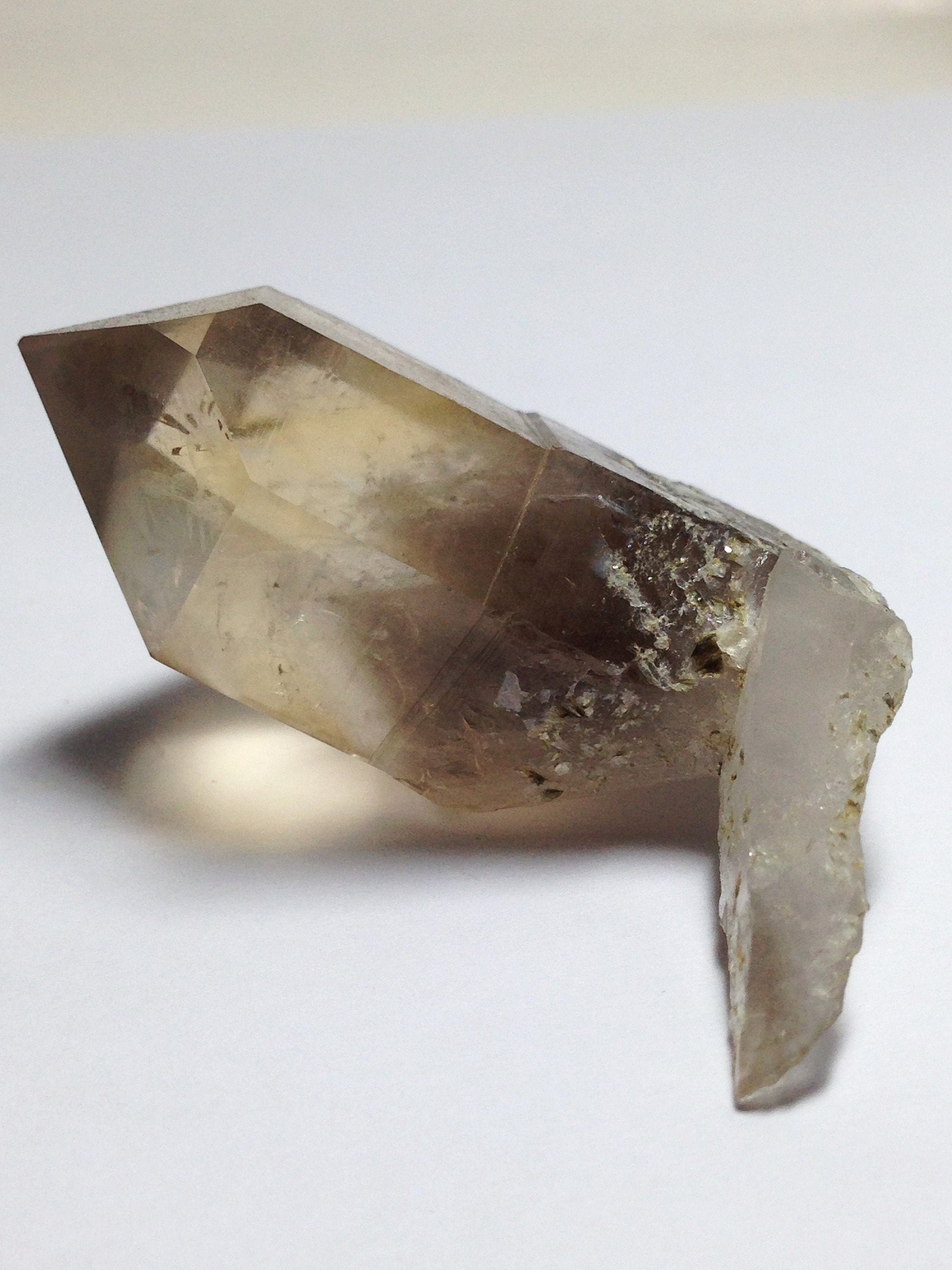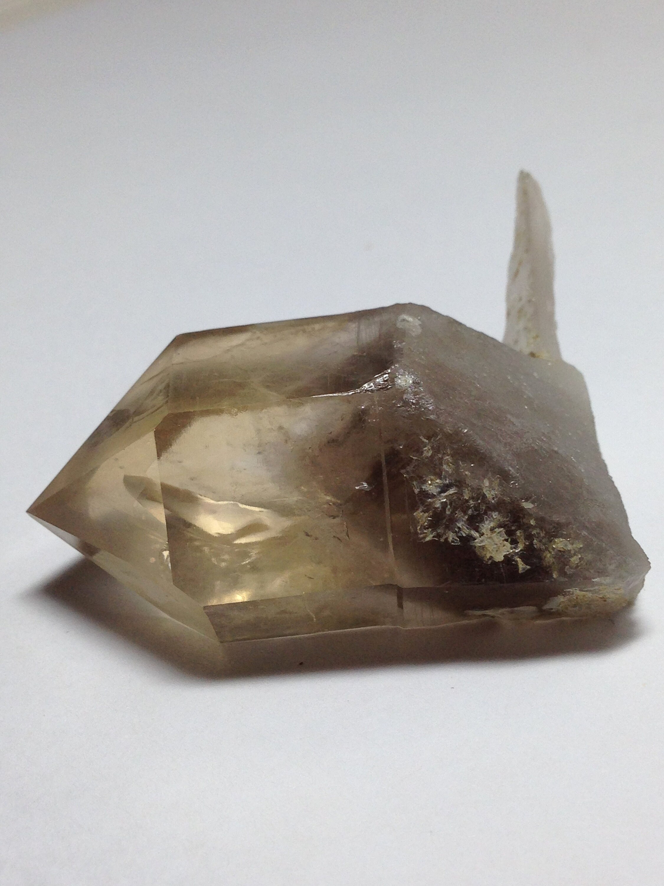 This perfectly Terminated, sharply pointed Citrine smoky quartz was found at Petersen Mountain aka Hallelujah Junction on the Nevada side of the hill. This piece weighs 35.8 grams / 179 carats and measures approximately 47mm x 25mm x 20mm. There is a secondary tabular quartz crystal that protrudes from the side of the main crystal at the very bottom. Some of the main crystal faces have an interesting semi-frosted luster on them. Internally this Quartz is quite clear with a dark and hazy 3D phantom point ascending out of the base of the crystal. This phantom is surrounded by lovely Devic Temple inclusions. There are even some Rainbows to be discovered and seen. Both the main crystal and secondary tabular crystal have a sharp pointed end. The tabular crystal is almost blade-like. The bottom-side is naturally etched and perfectly healed. This healed region of starbrary etching has a luster that picks up and reflects light. This piece also contains an Isis face. It is an ideal Metaphysical crystal, however, it is an excellent collector piece as well. The only one we have!