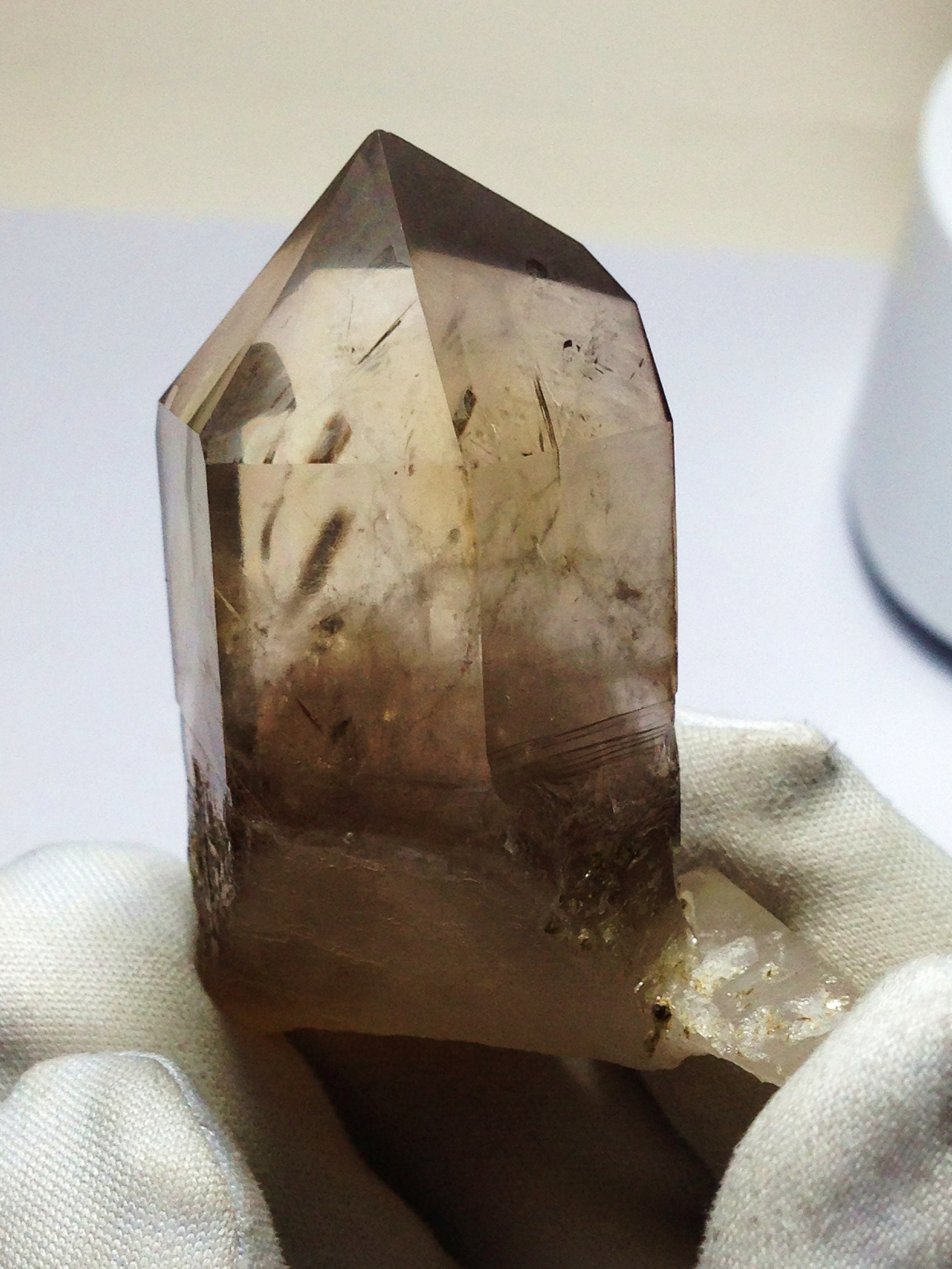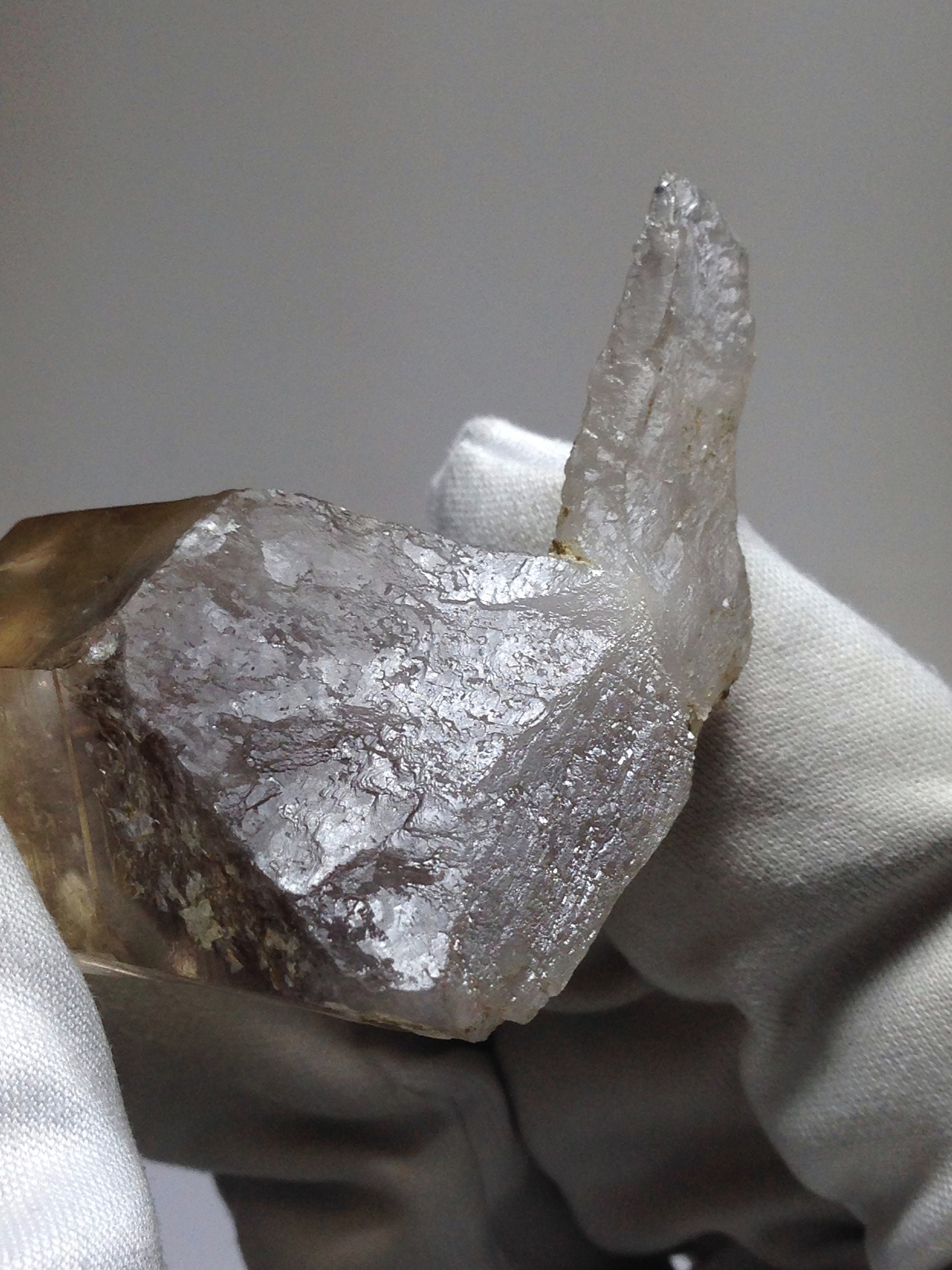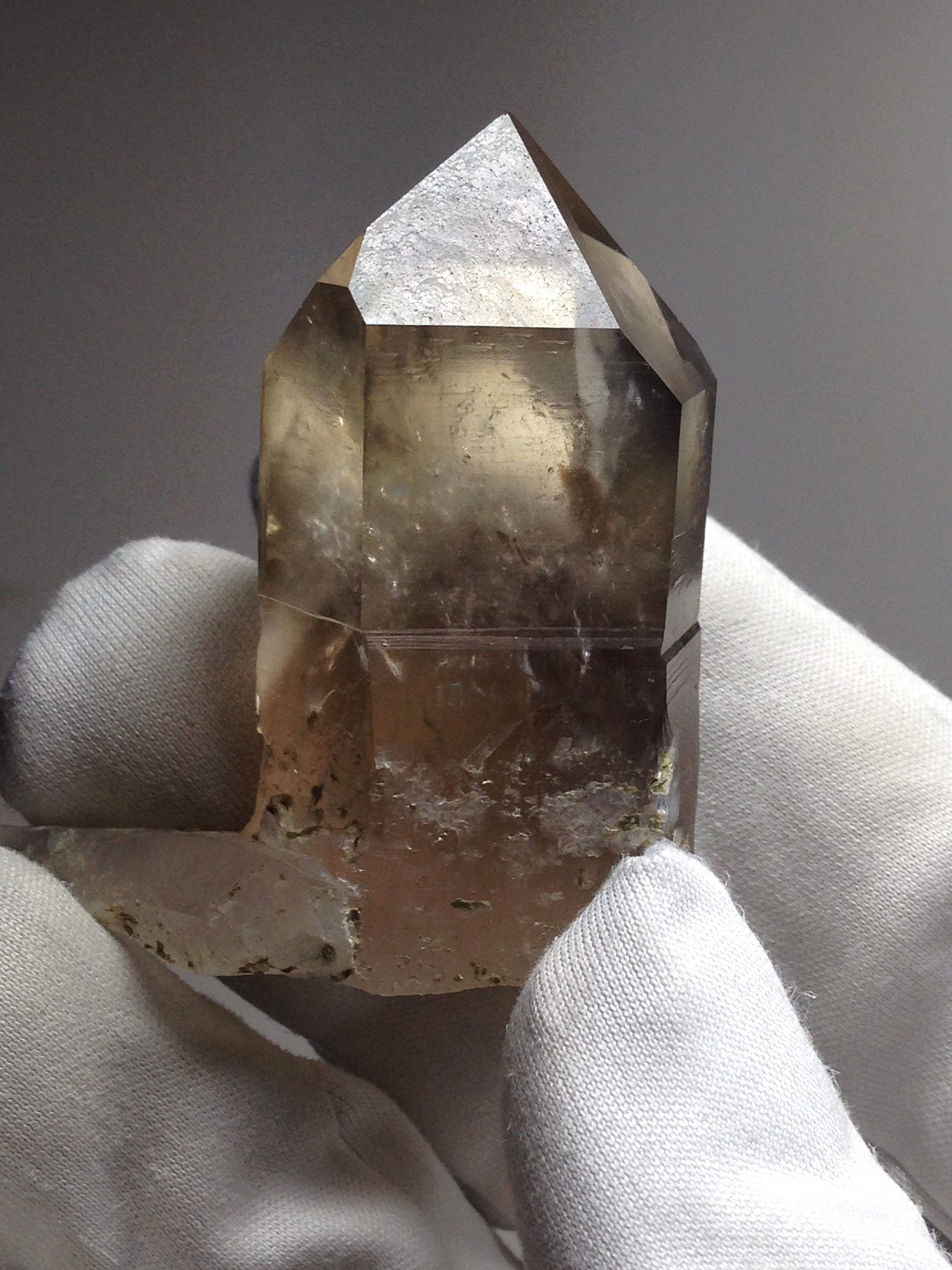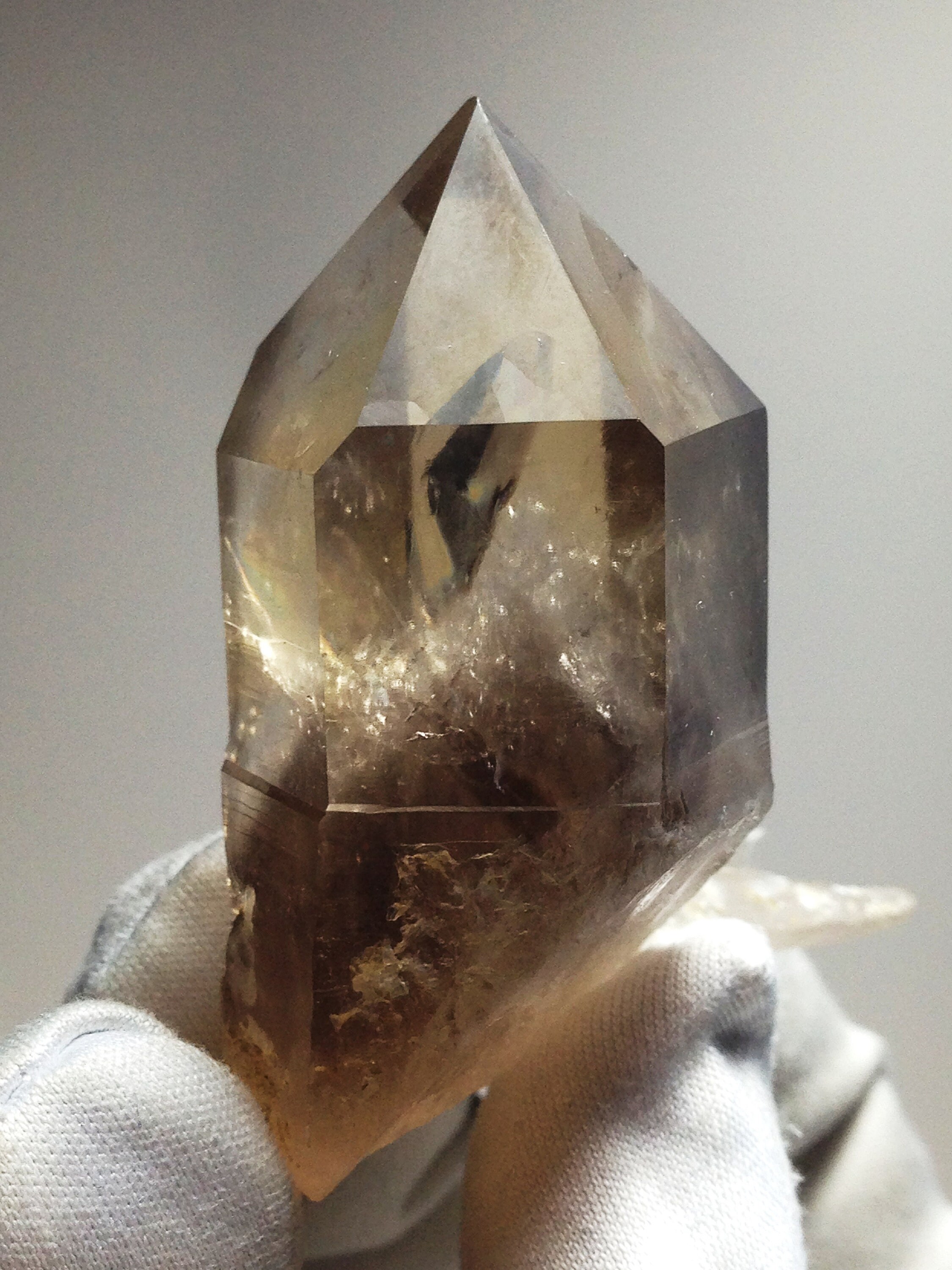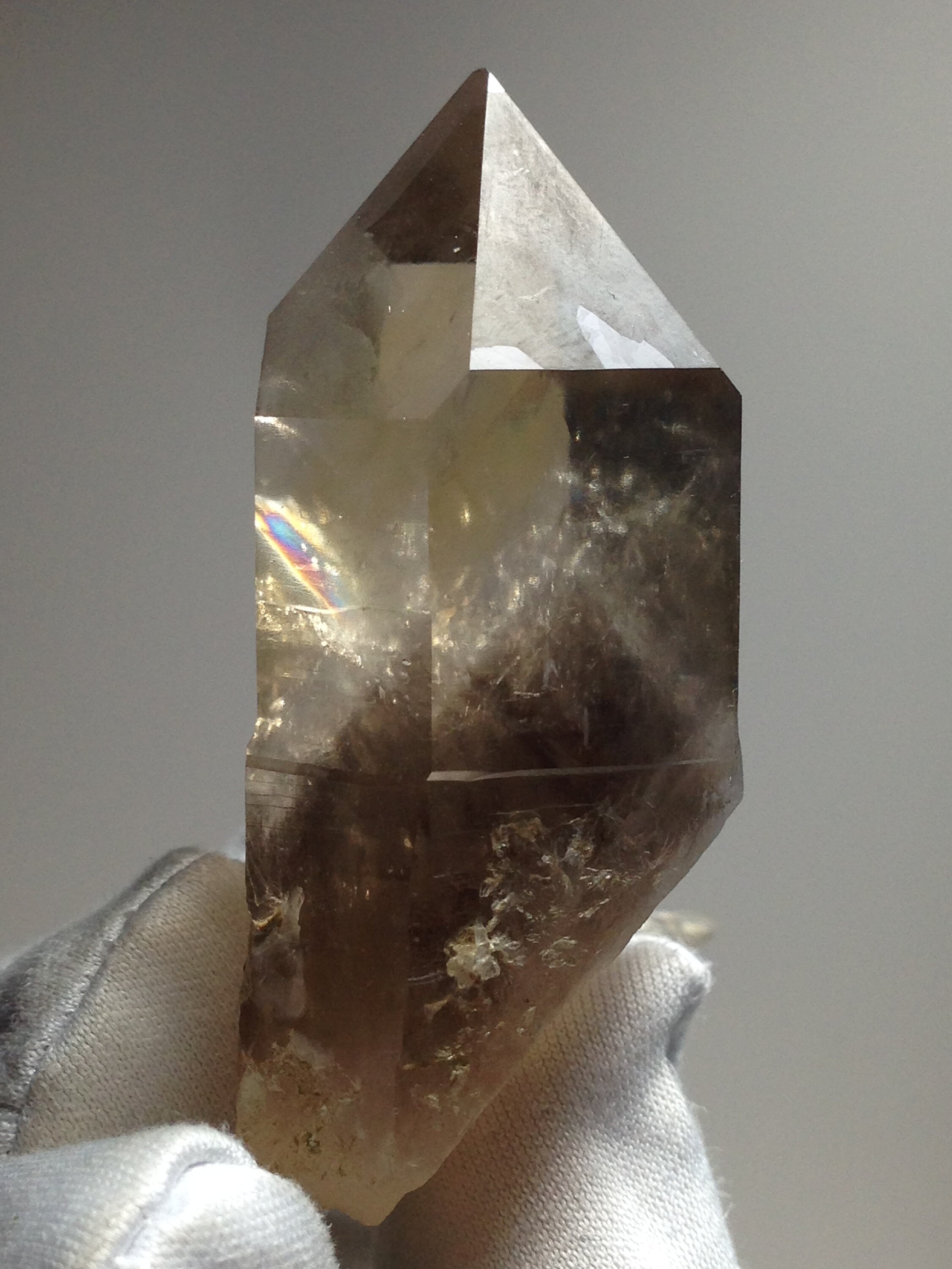 This perfectly Terminated, sharply pointed Citrine smoky quartz was found at Petersen Mountain aka Hallelujah Junction on the Nevada side of the hill. This piece weighs 35.8 grams / 179 carats and measures approximately 47mm x 25mm x 20mm. There is a secondary tabular quartz crystal that protrudes from the side of the main crystal at the very bottom. Some of the main crystal faces have an interesting semi-frosted luster on them. Internally this Quartz is quite clear with a dark and hazy 3D phantom point ascending out of the base of the crystal. This phantom is surrounded by lovely Devic Temple inclusions. There are even some Rainbows to be discovered and seen. Both the main crystal and secondary tabular crystal have a sharp pointed end. The tabular crystal is almost blade-like. The bottom-side is naturally etched and perfectly healed. This healed region of starbrary etching has a luster that picks up and reflects light. This piece also contains an Isis face. It is an ideal Metaphysical crystal, however, it is an excellent collector piece as well. The only one we have!