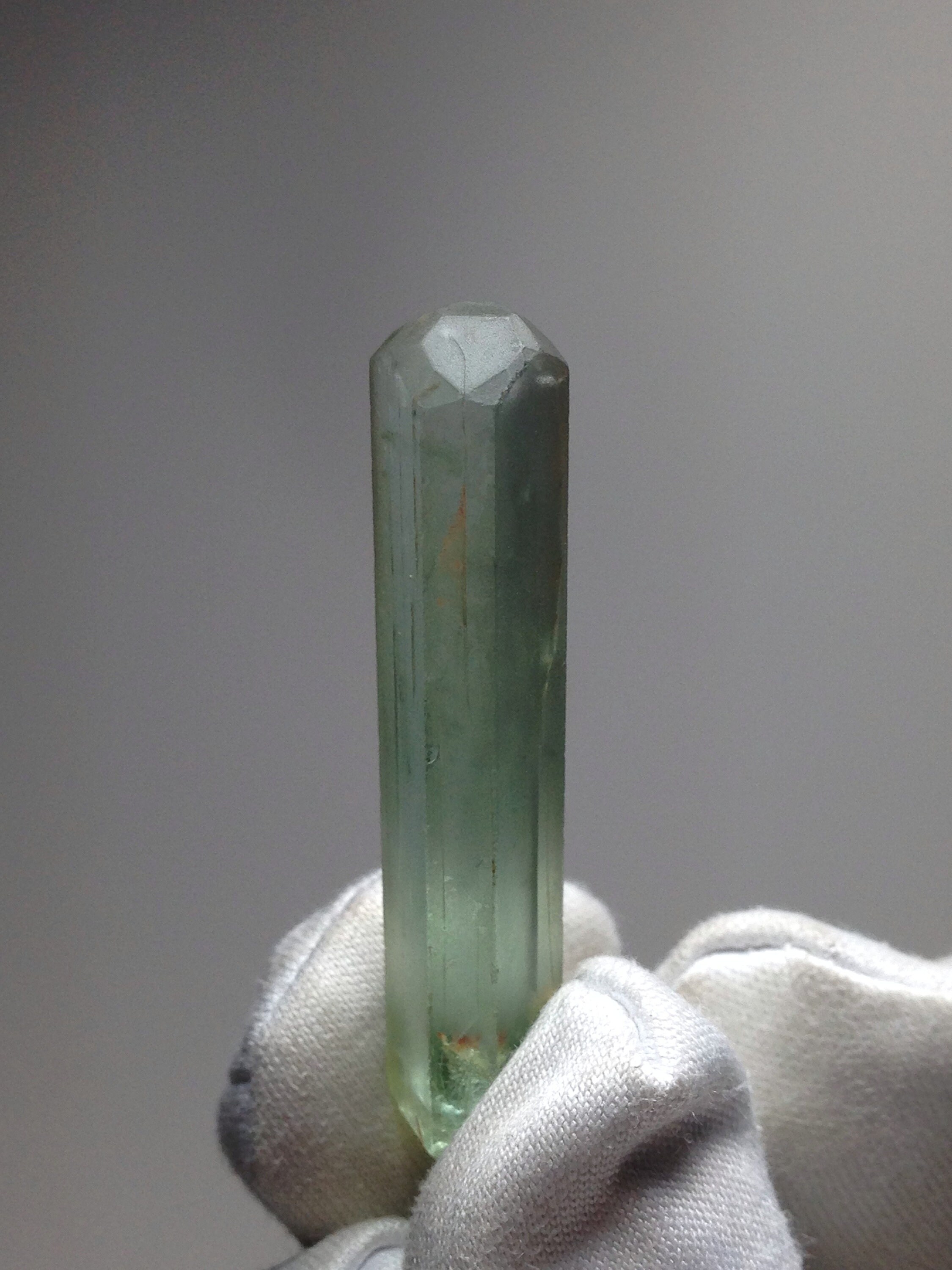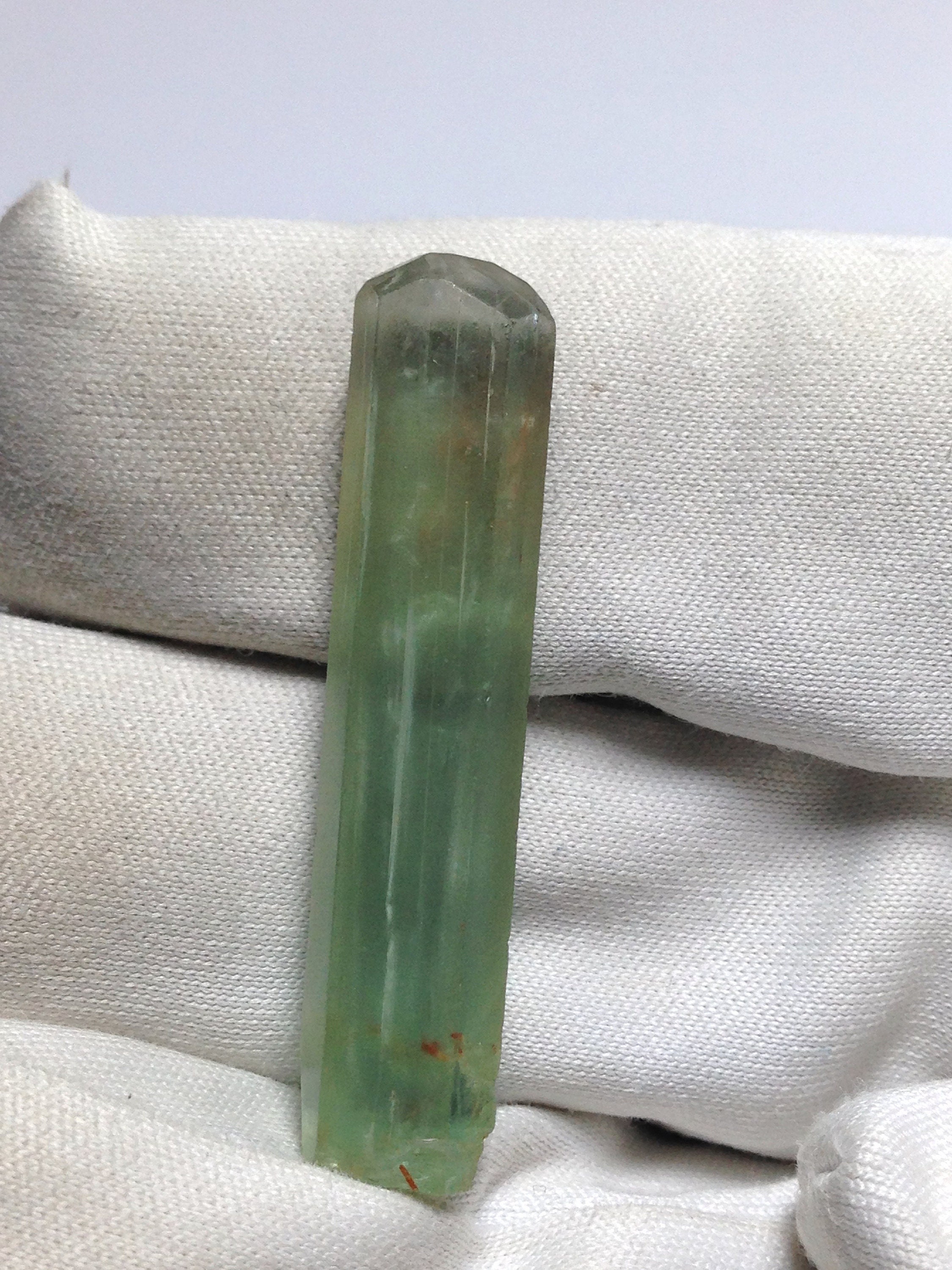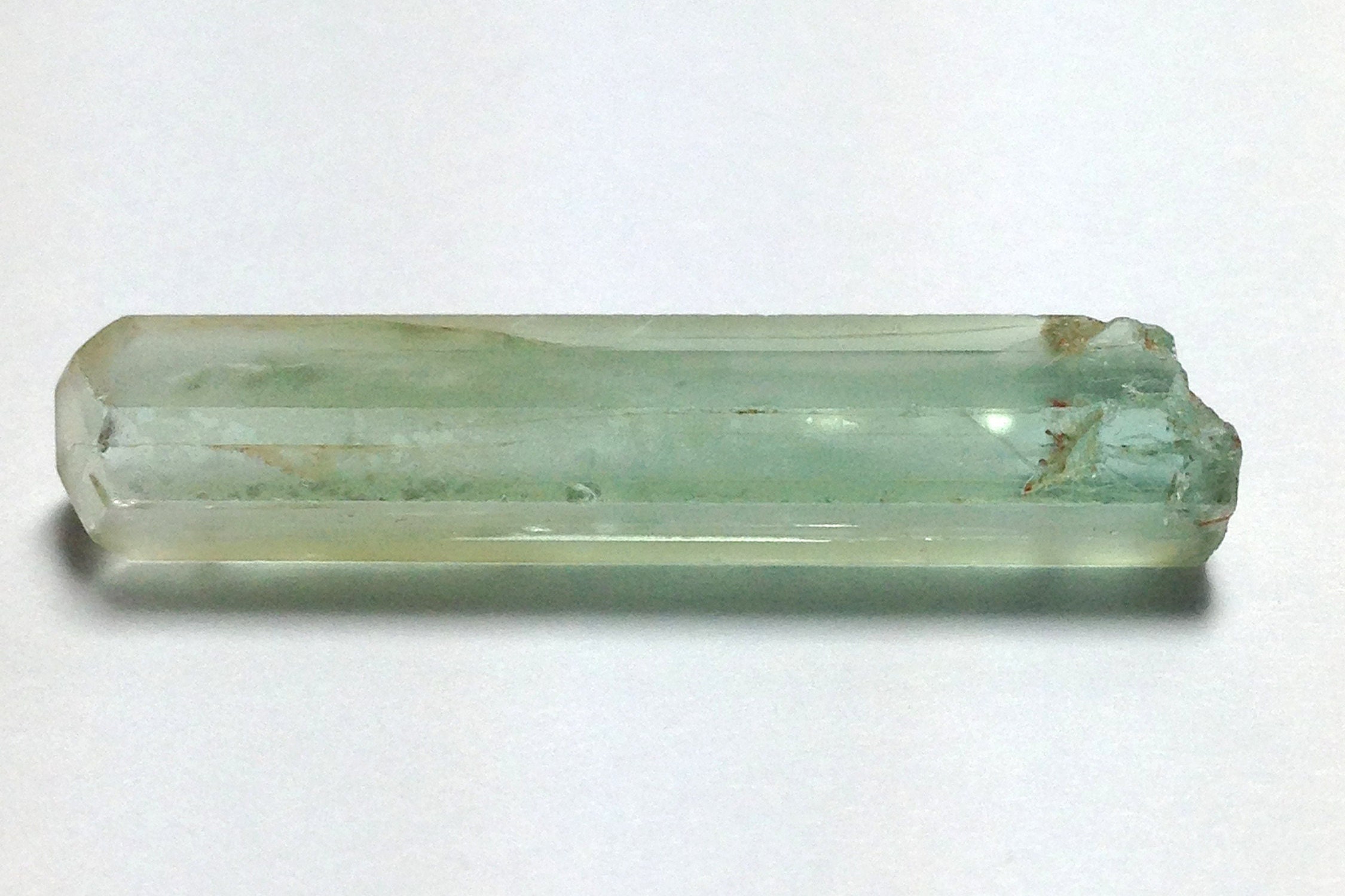 This is a lovely 100% natural and very distinct green & slightly blue colored Aquamarine from the rare locality of Tres Barras Mine, Teofilo Otoni, Minas Gerais, Brazil. It weighs 3.807 grams / 19.035 carats and measures 36.12mm x 7.37mm x 6.68mm. It has one of the best complex faced Terminations of any beryl that I've seen. The crystal is saturated with gradient-style shades of old-school Brazilian seafoam green. To see another example of this material Please Refer to the following link for an Archived listing from John Betts.