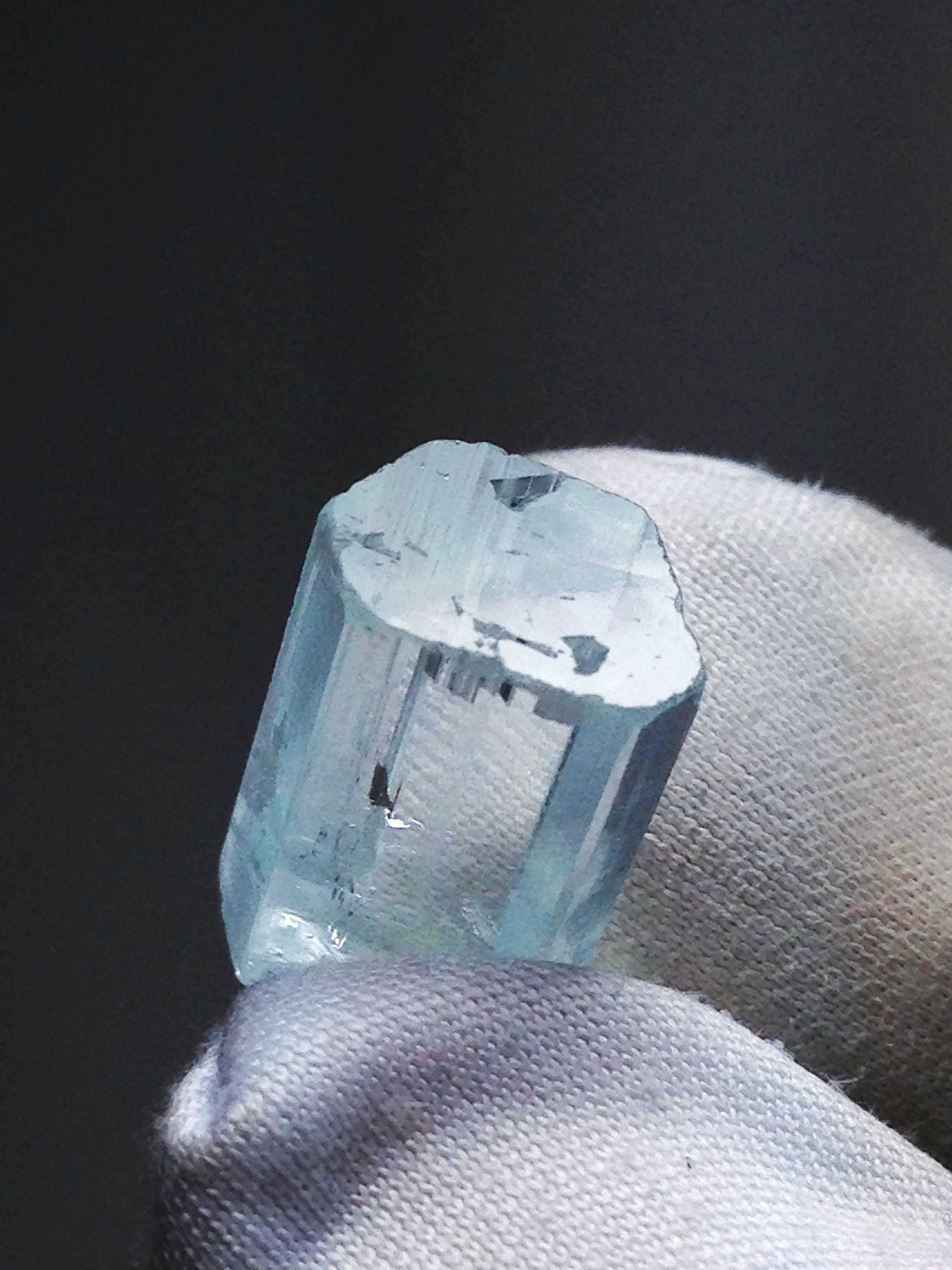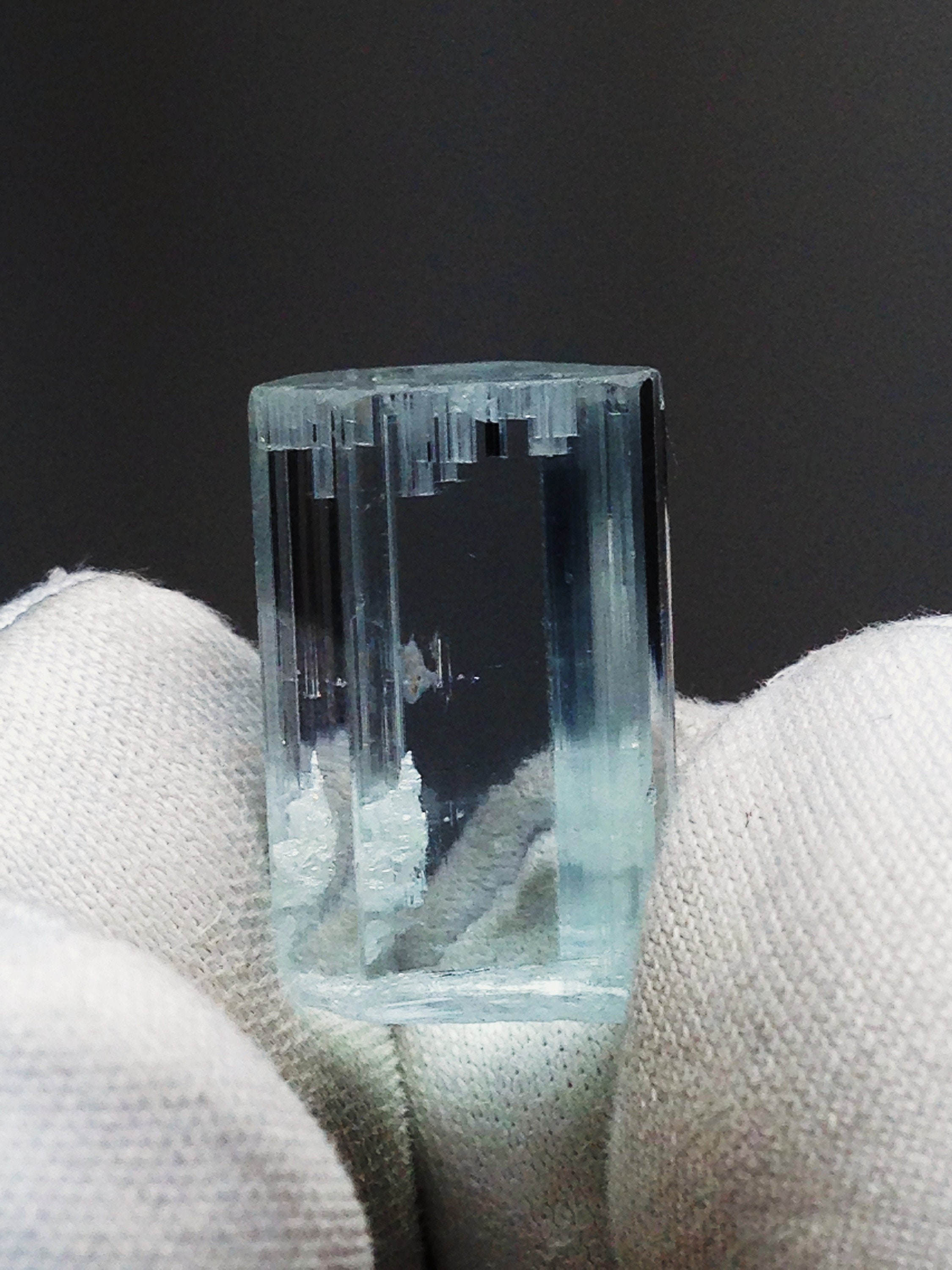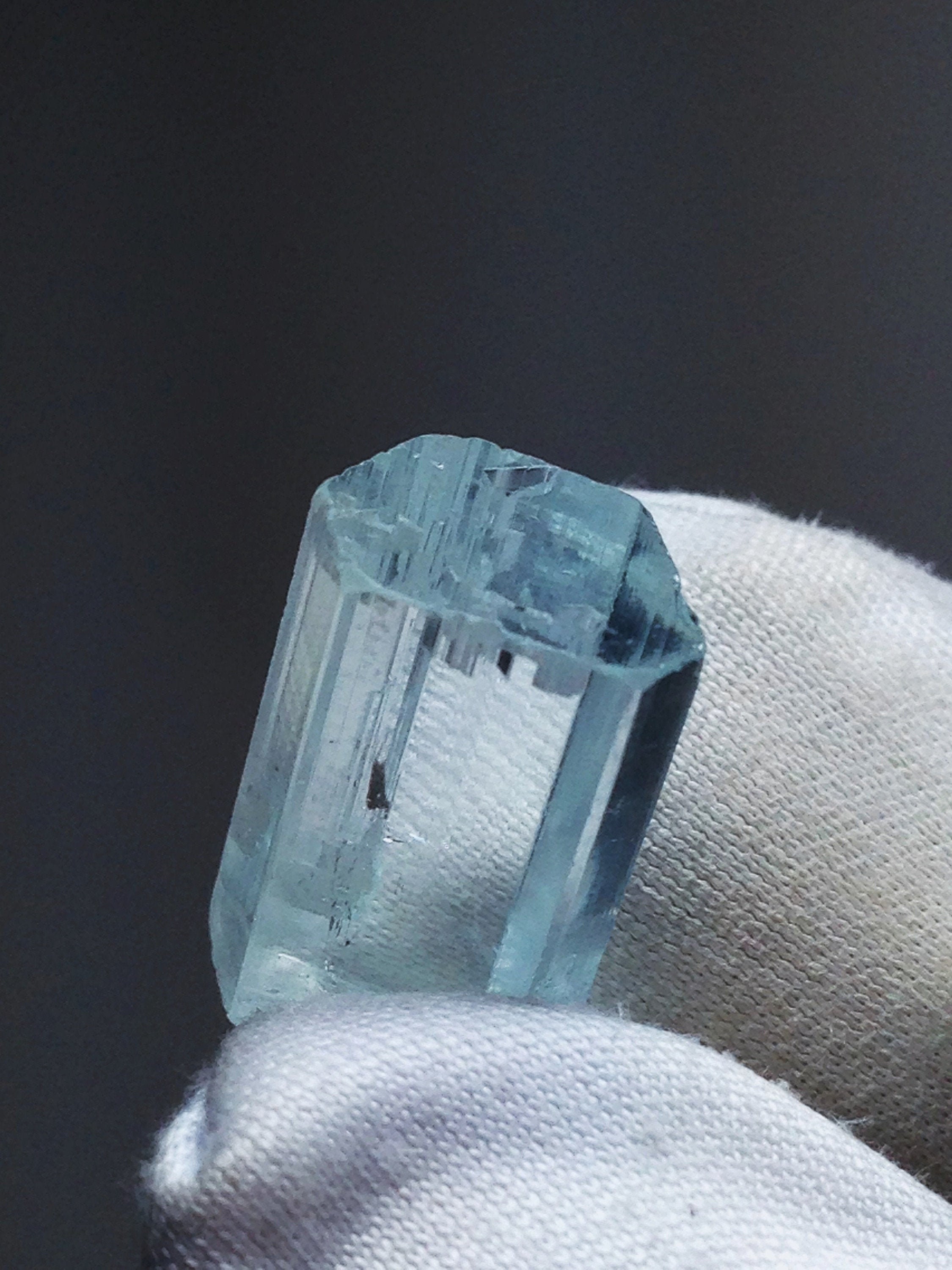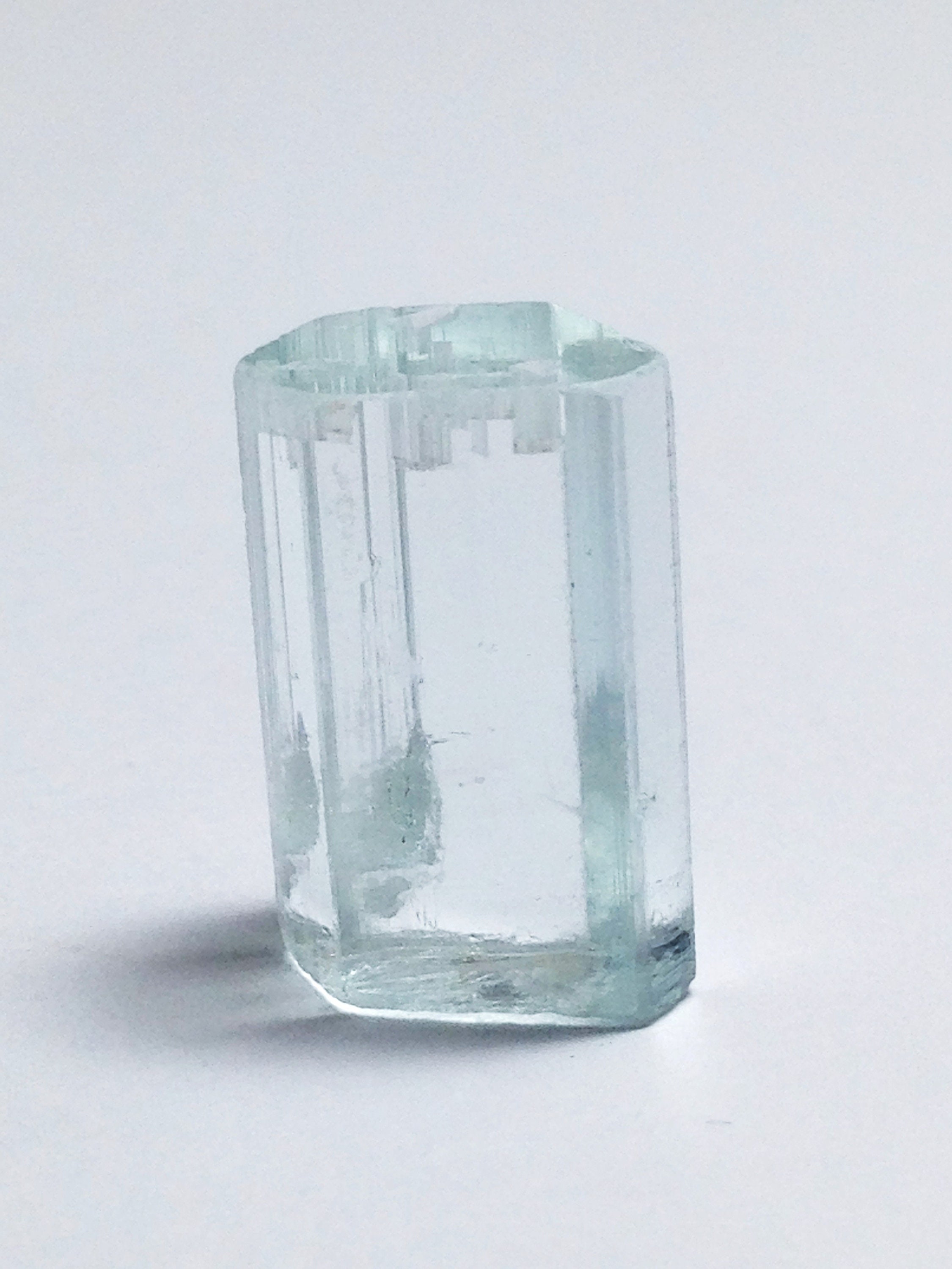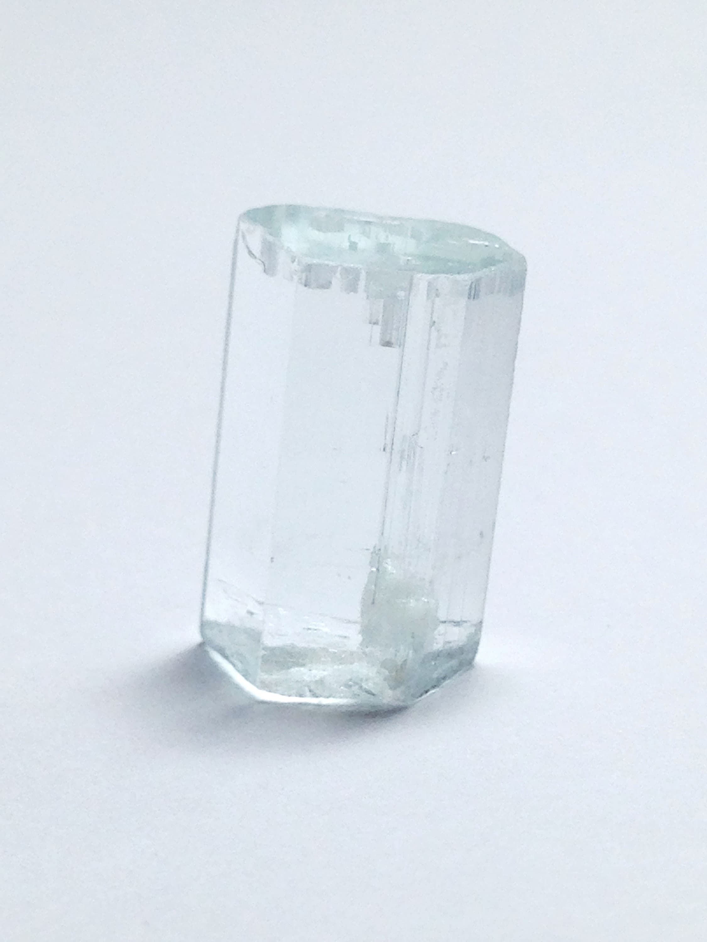 This Aquamarine crystal weighs 2.398 grams / 11.99 carats and measures 16.33mm x 9.57mm x 7.22mm. It is transparent with a very light steel blue color; nearly colorless beryl. It is doubly terminated with a healed / etched bottom and flat top. The top termination does have some very small bevels on it, as well as negative crystal openings at the C-axis, (see photo#2). Completely natural in every way, the body of this crystal is similar to that of an emerald cut stone. The small cluster of crystallized Albite inclusion is 100% internal and not on the outside of the beryl crystal. The outside of this Aquamarine crystal is without damages. The hollow tubes of negative crystal growth show an interesting chatoyance when viewed at certain angles. This light blue Aquamarine beryl is ideal for thumbnail collectors who want high quality gem crystals in their collections. Please feel free to contact me with any questions. Metaphysical information is listed below. Thanks for looking!