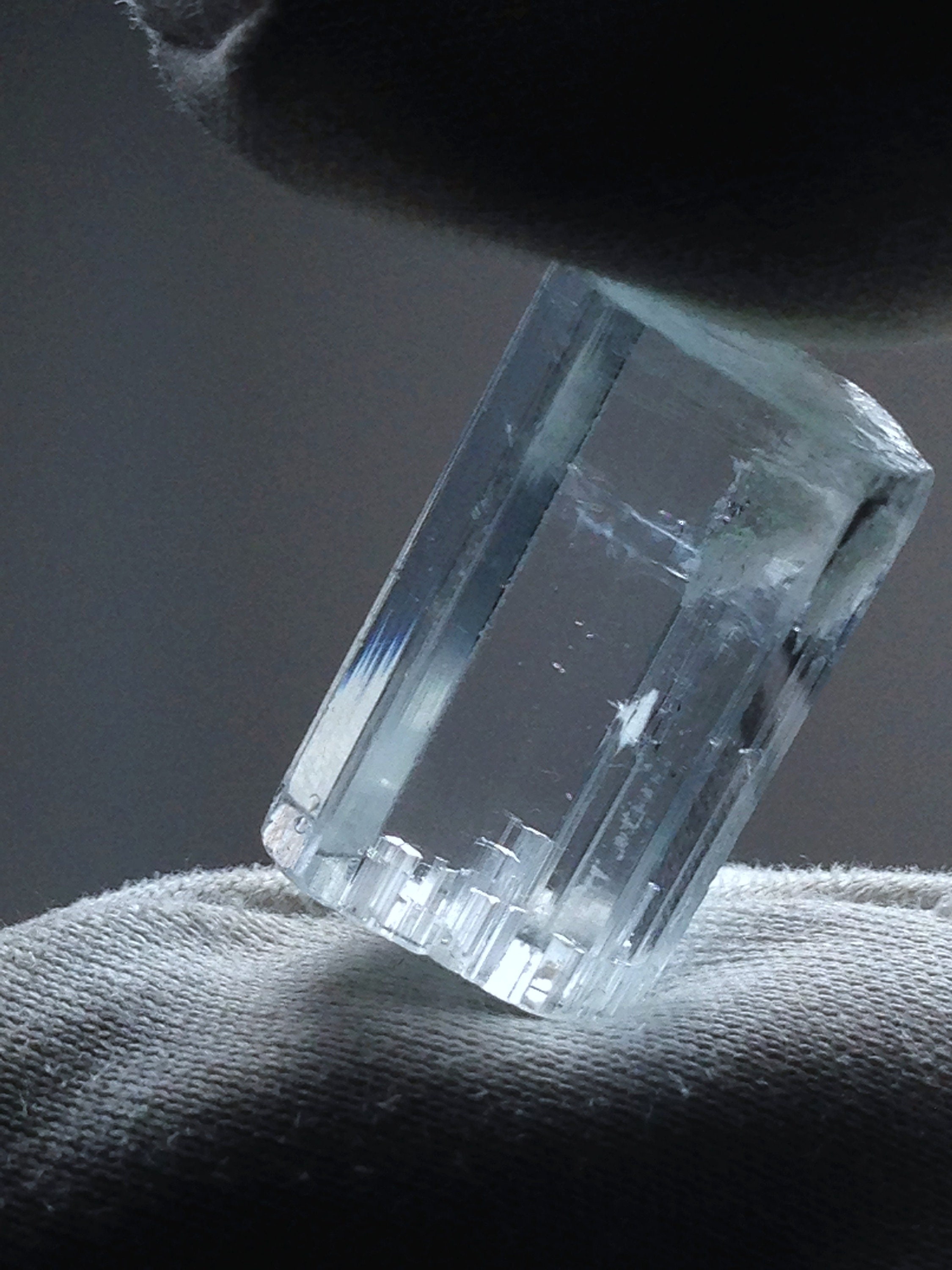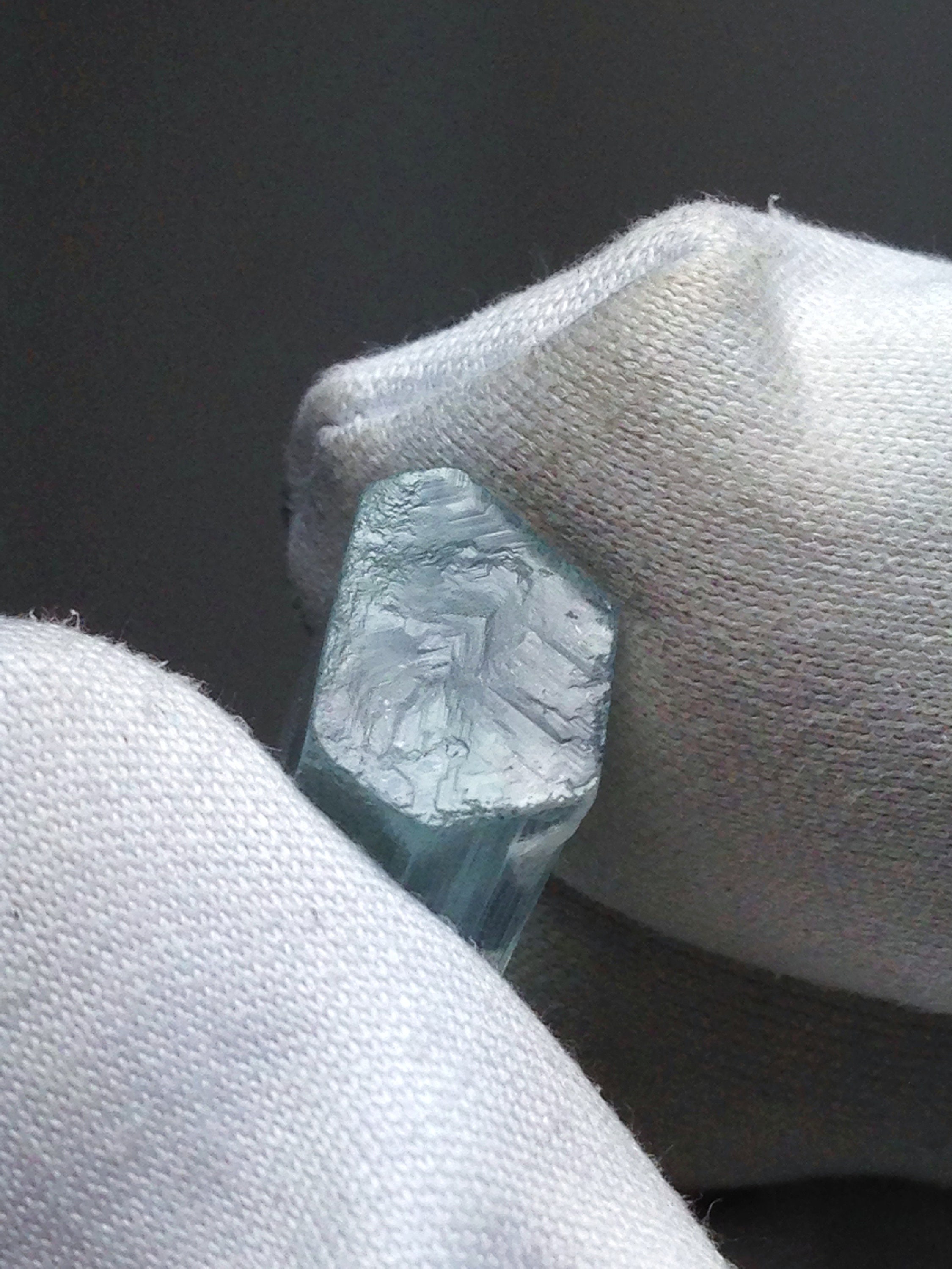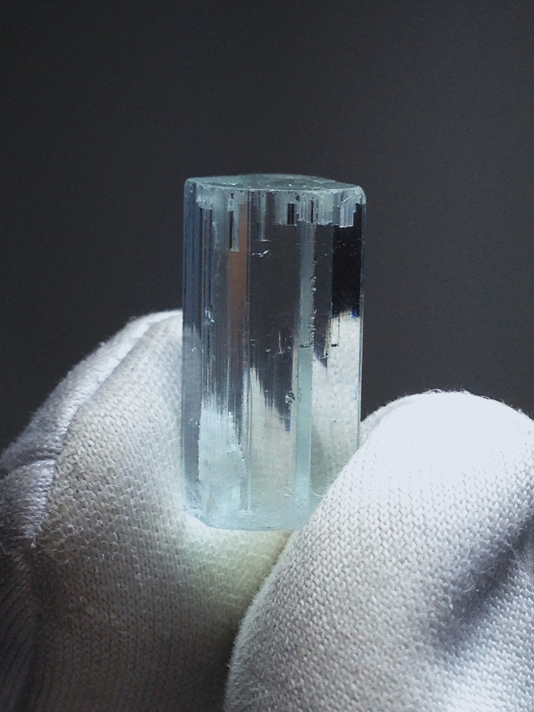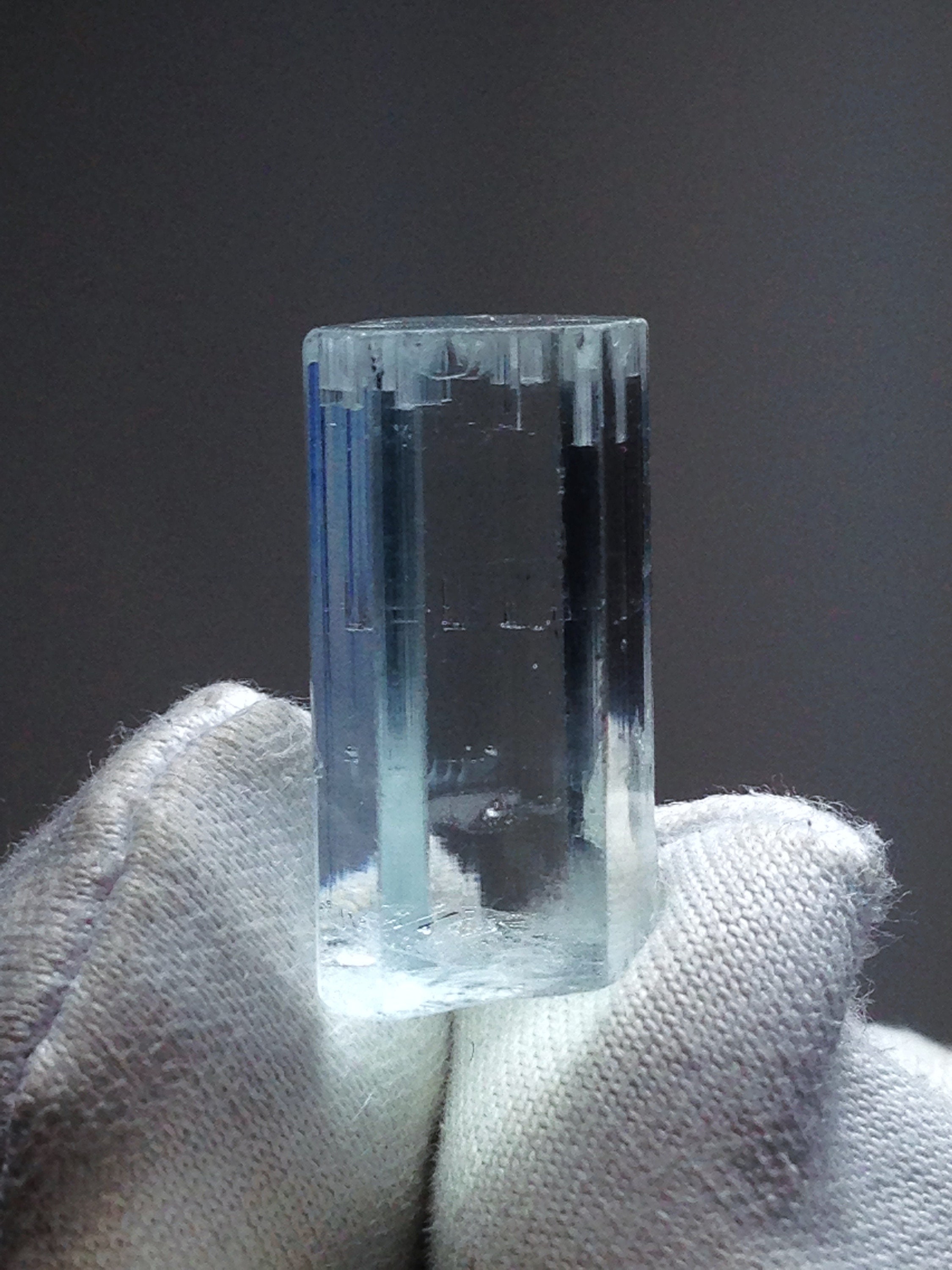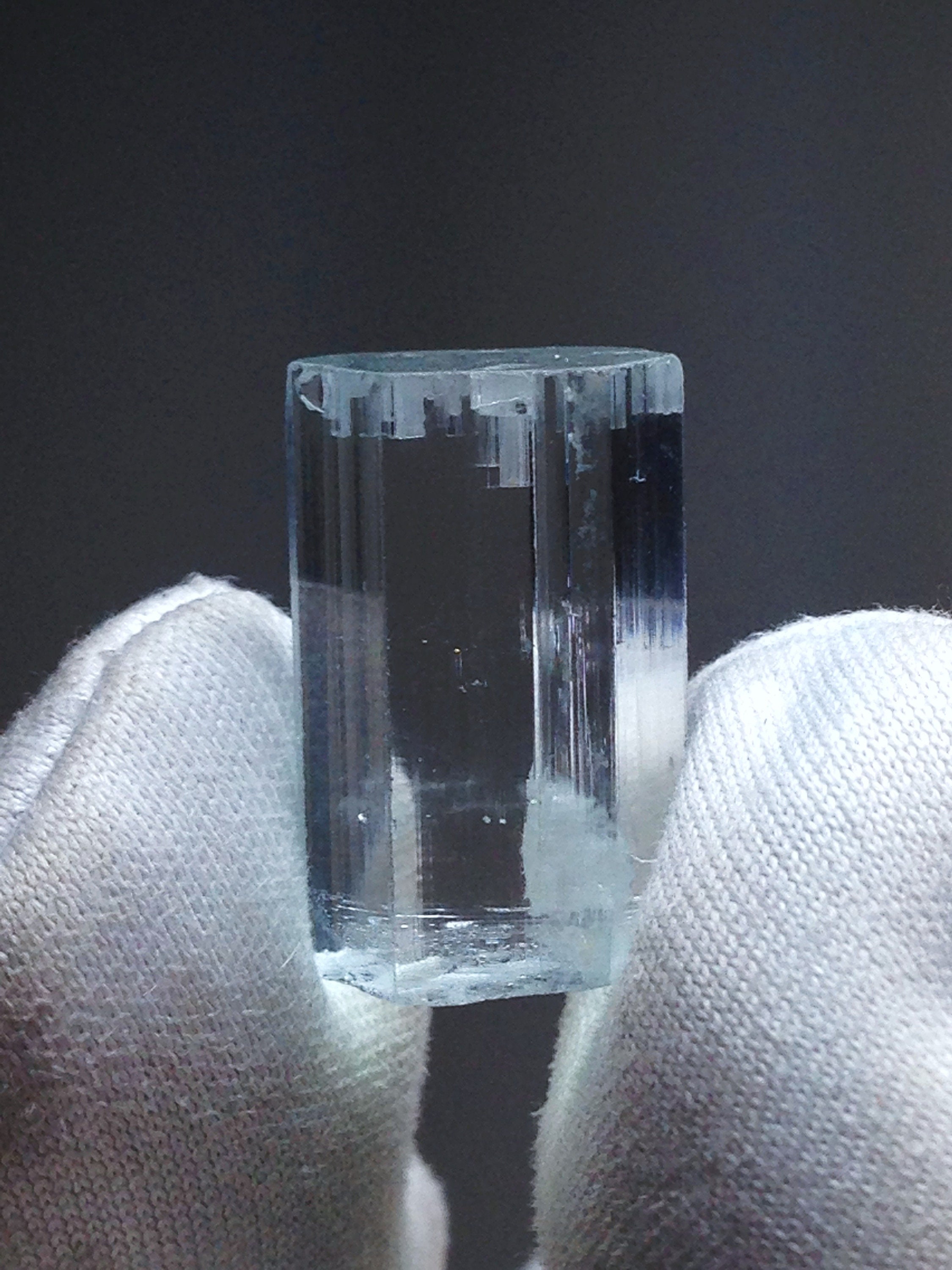 This Aquamarine crystal weighs 2.398 grams / 11.99 carats and measures 16.33mm x 9.57mm x 7.22mm. It is transparent with a very light steel blue color; nearly colorless beryl. It is doubly terminated with a healed / etched bottom and flat top. The top termination does have some very small bevels on it, as well as negative crystal openings at the C-axis, (see photo#2). Completely natural in every way, the body of this crystal is similar to that of an emerald cut stone. The small cluster of crystallized Albite inclusion is 100% internal and not on the outside of the beryl crystal. The outside of this Aquamarine crystal is without damages. The hollow tubes of negative crystal growth show an interesting chatoyance when viewed at certain angles. This light blue Aquamarine beryl is ideal for thumbnail collectors who want high quality gem crystals in their collections. Please feel free to contact me with any questions. Metaphysical information is listed below. Thanks for looking!